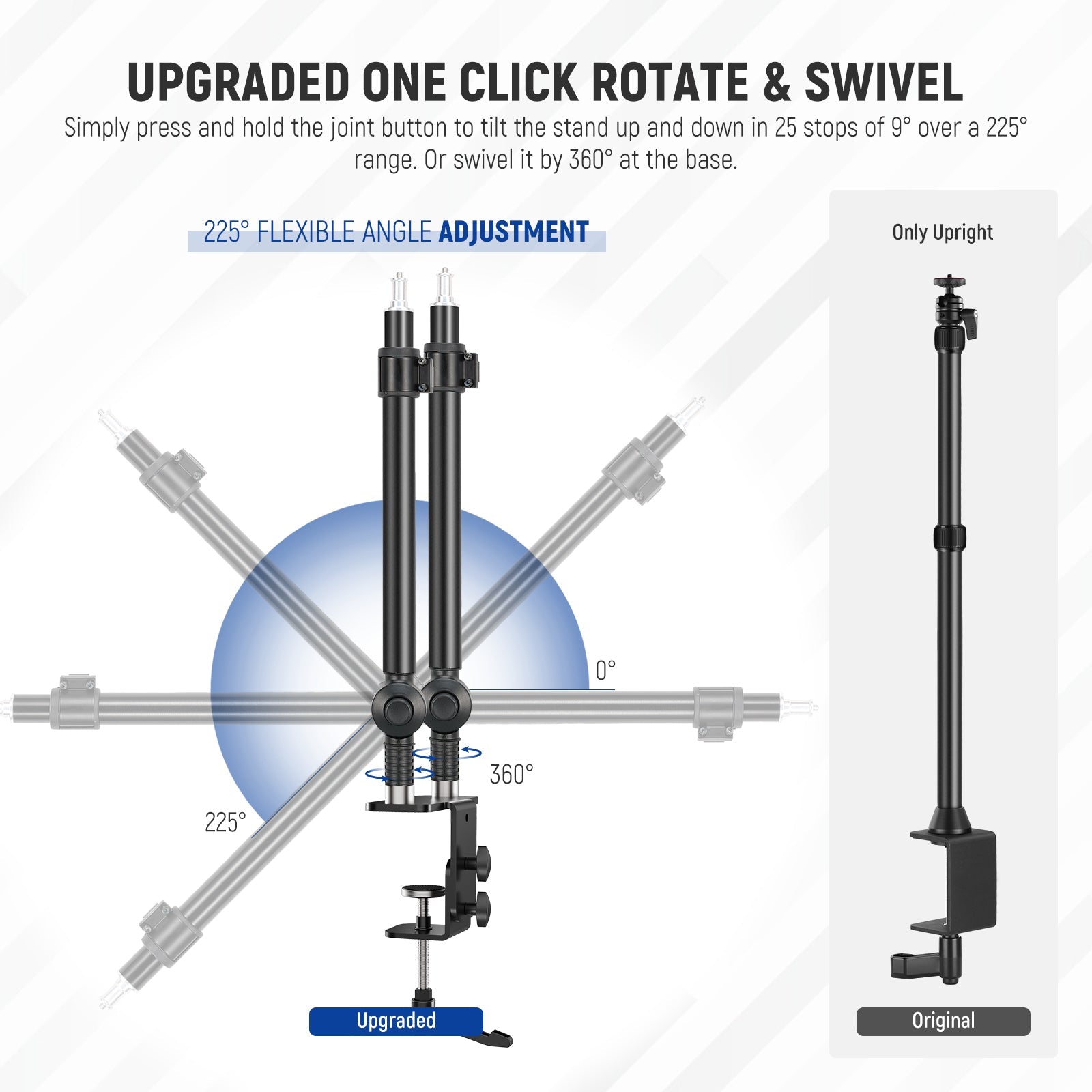 - Upgraded One Click Rotate & Swivel- Press and hold the joint button to tilt the stand up and down in 25 stops of 9° over a 225° range. 360° swivel at the base, and freely meets all the needs of support angles. Even can bend over horizontally on the desk to save space and keep it out of the way when not in usage. Includes 6 cable ties for effective cable management