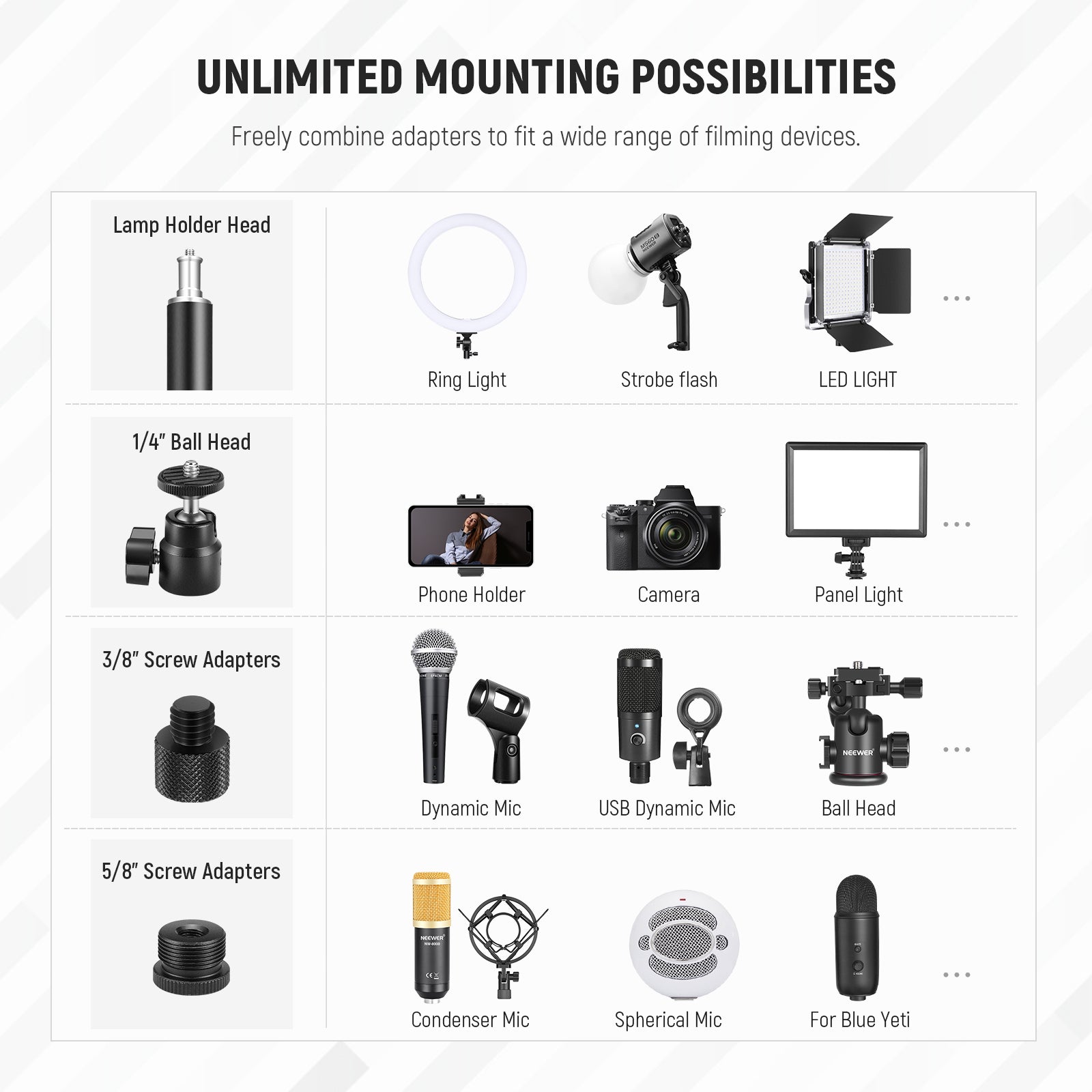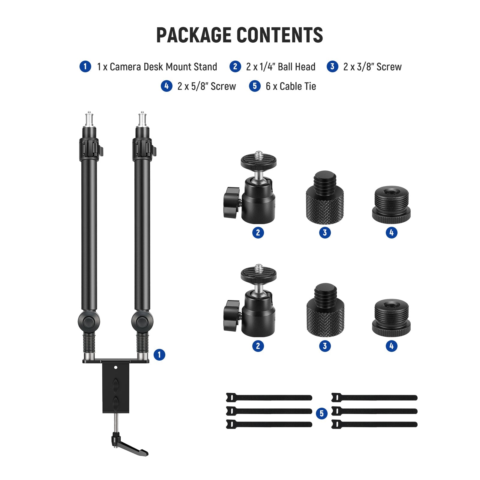 - Wide Compatibility- With the included two 1/4" ball heads, coupled with 1/4" to 3/8" screw adapters and 1/4" to 5/8" screw adapters, the tabletop mount stands can connect to DSLR cameras, phone holders, ring lights, key lights, microphones, tripod heads (all not included) etc. Ideal for live streaming, vlogging, Youtube TikTok video recording, overhead tabletop photography, and more