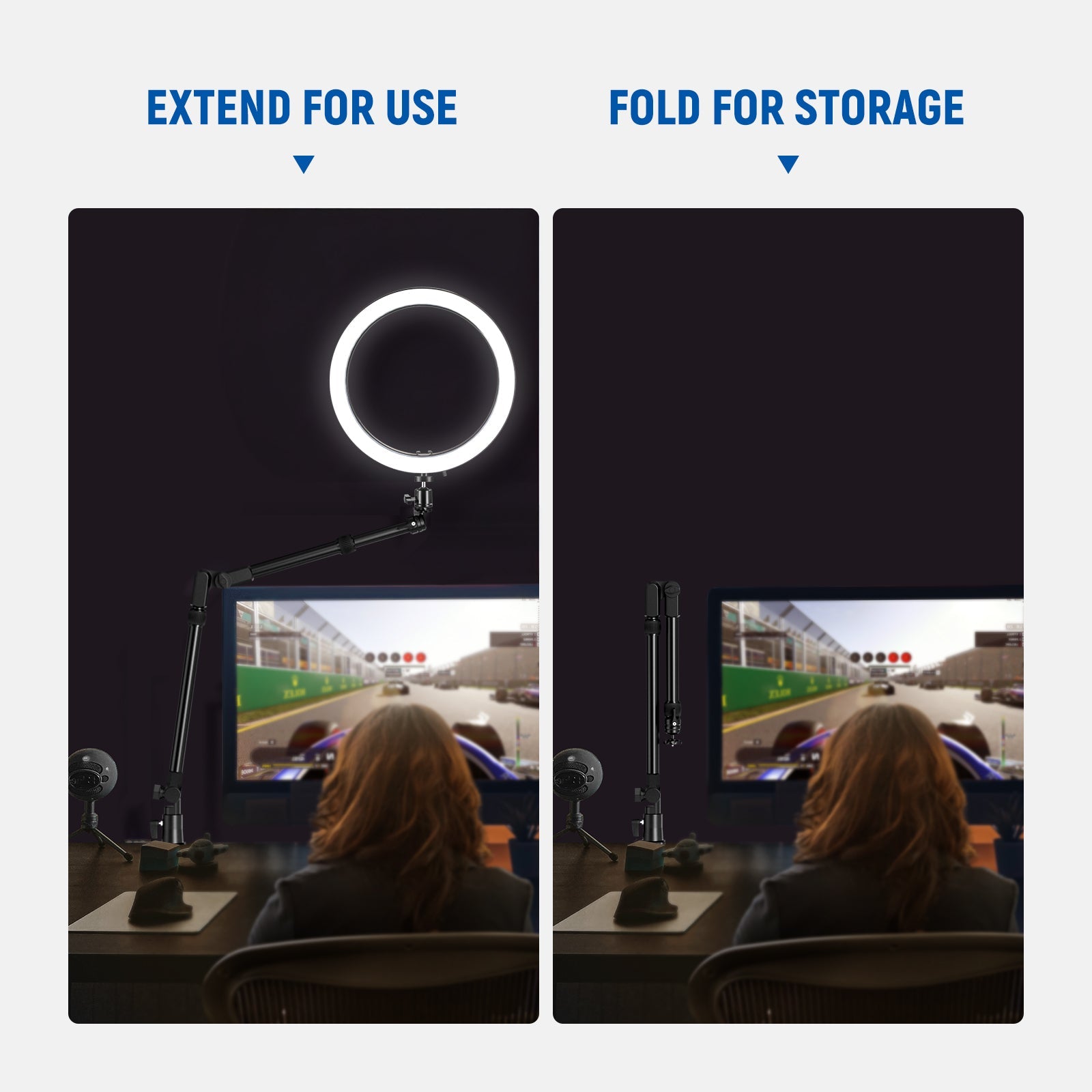 - Adjustable Height & Angle- This articulating camera and microphone desk stand folds at two points and extends up to 45.3"/115cm, allowing you to mount your phone or camera at the desired height and angle for table overhead shots from any perspective. Also as a desktop low profile but super grip mic boom arm stand. Rotary knobs enable quick adjustments and secure locking in place. Note: The arm has 2 folding joints and 2 telescopic sections, forming 4 segments in total