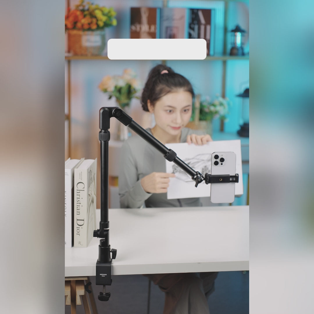 - Robust Aluminum Alloy Build- NEEWER DS023 overhead camera mount stand is constructed of premium aluminum alloy with a black anodized finish, ensuring excellent durability and capable of supporting devices up to 4.41lb/2kg. The sturdy super C clamp secured by a tightening knob, along with the firm joints between the arms, ensures your device stays securely stabilized during use