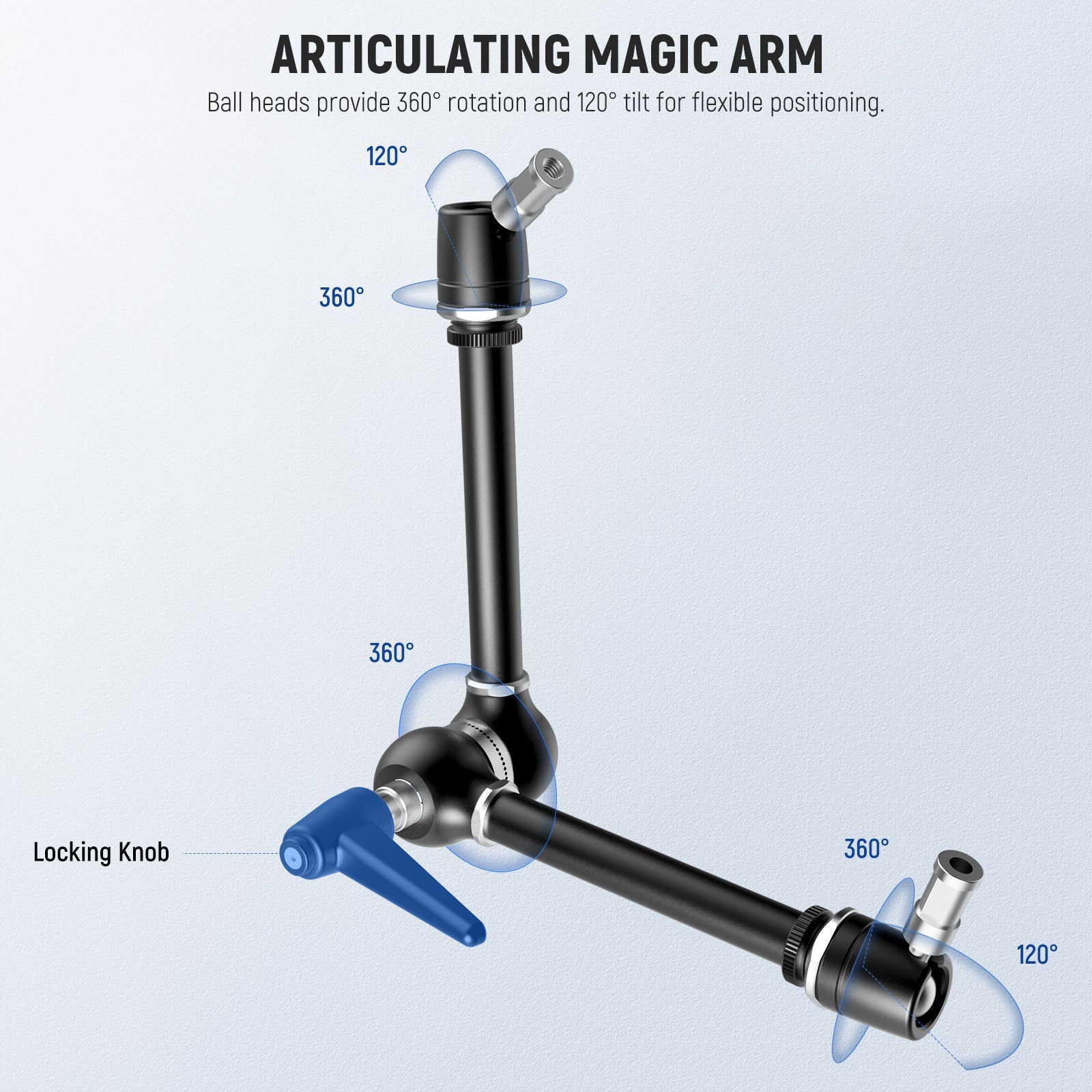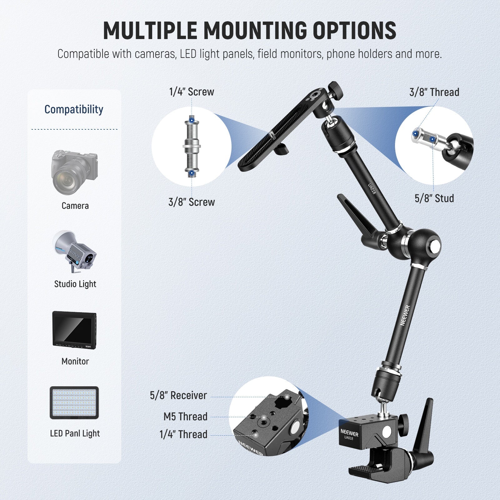 - Magic Arm Camera Mount Kit- The multifunctional camera clamp mount includes a 21"/53cm articulating magic arm, a reinforced super clamp, an extended mounting plate, and a 1/4" to 3/8" screw adapter for flexible yet stable mounting. Whether you're shooting in tight spaces or need to capture from unique angles, you can easily secure your DSLR mirrorless cameras, LED video light panels, field monitors, camera and phone cages and more photography accessories to achieve your desired shots