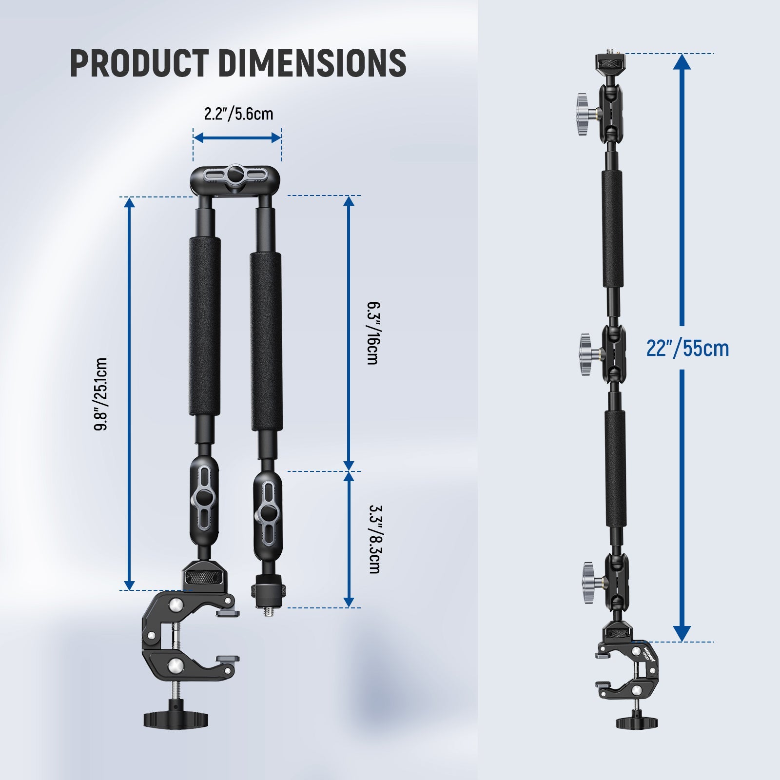 - Articulating Arm with Ball Heads- The two section friction boom arm offers a 55cm/22" extended length, and is equipped with three sets of 360° dual ball head adapters, enhancing the flexibility of angle and height, and secured with a simple twist of the locking knobs. Each ball head comes with multiple rubber rings to firmly grip your gear and prevent accidental drops