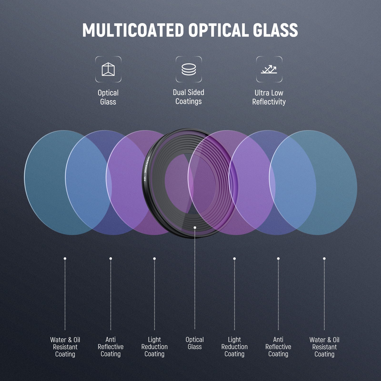 - Multicoated Optical Glass- Optical glass with multiple protective coatings delivers clear footage while resisting water, fingerprints, and scratches