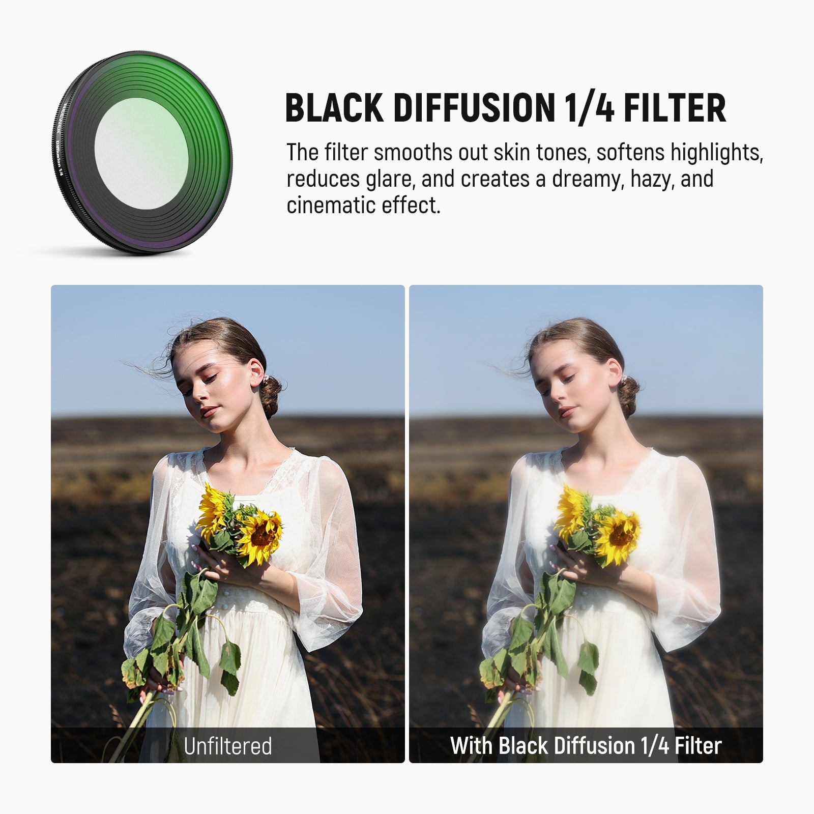 - Cinematic, Diffusive Effect- Black diffusion 1/4 filter smooths out skin tone and adds a dreamy, cinematic effect to portrait photography, selfies, and personal vlogs