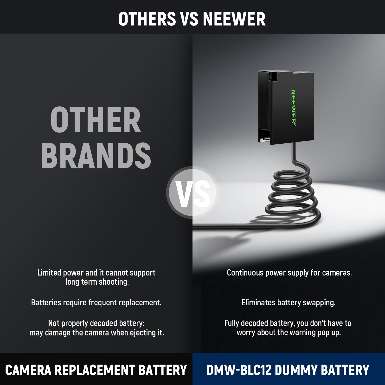 - Eliminate Battery Swapping- No more frequent battery replacement! NEEWER DR-BLC12 dummy battery kit replaces DMW-BLC12 DMW-BLC12E DMW-BLC12PP batteries, ensuring continuous power supply for your camera to allow you to shoot for extended periods without interruption or the need for spare batteries