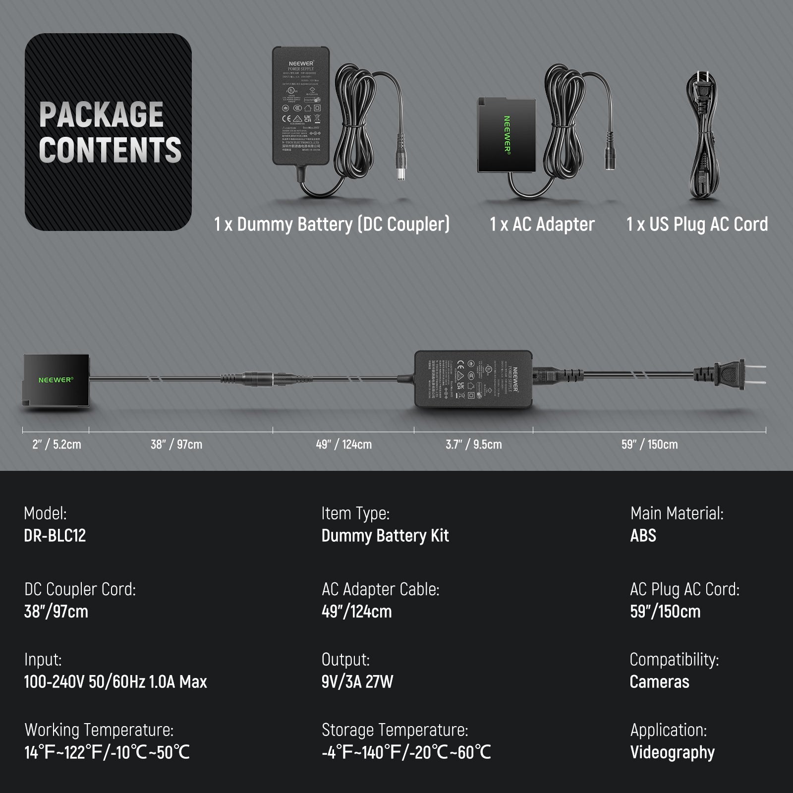 - 146"/371cm Super Length- With a 38"/97cm DC coupler, a 49"/124cm AC power adapter, and a 59"/150cm US plug AC cord, the dummy battery kit (combined length: 146"/371cm) offers ample cable length for flexible setup and positioning, adapting to various shooting environments effortlessly