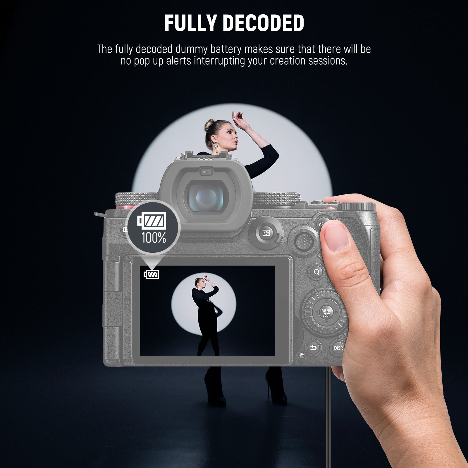 - Compatibility- This DMW-BLK22 dummy battery kit for continuous power supply is compatible with Panasonic Lumix DC-S9 DC-G9 II DC-S5 DC-S5 II DC-S5 IIX GH5 II GH6 S5II S5IIX S5M2 S5M2X GH5M2 Cameras