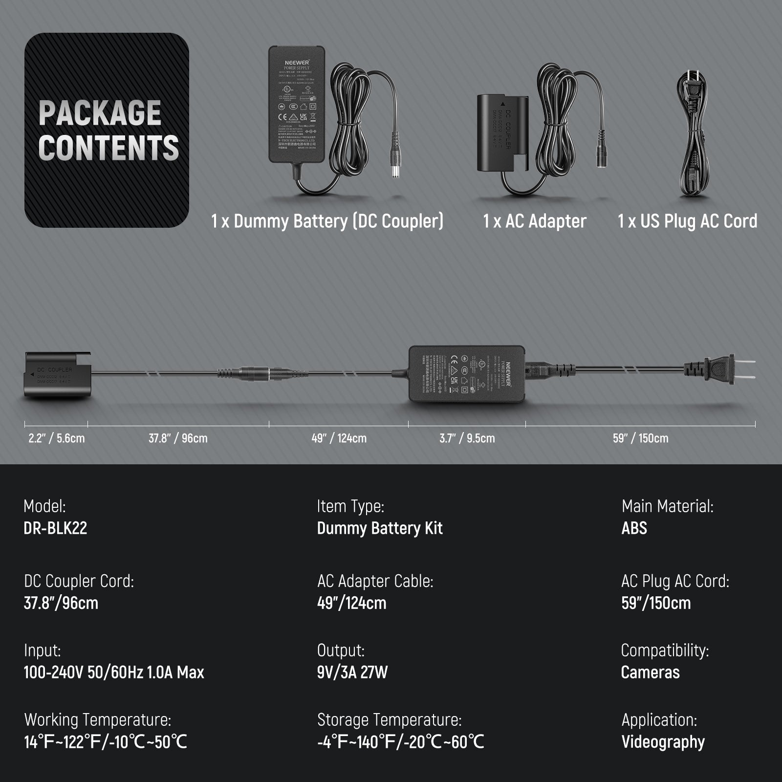 - Package Contents- The power supply kit for cameras includes 1 x DMW-BLK22 dummy battery, 1 x AC/DC adapter, and 1 x AC power cord. Perfect for professional photographers, videographers, vloggers, and content creators seeking hassle free power solutions