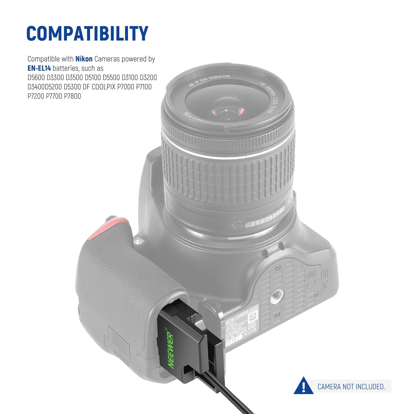 - Replacement Power Supply for EN-EL14 Battery- This battery charger set is a coupler dummy battery power supply replacement for EN-EL14 battery, compatible with Nikon D5600 D3300 D3500 D5100 D5500 D3100 D3200 D3400 D5200 D5300 DF Coolpix P7000 P7100 P7200 P7700 P7800 Cameras