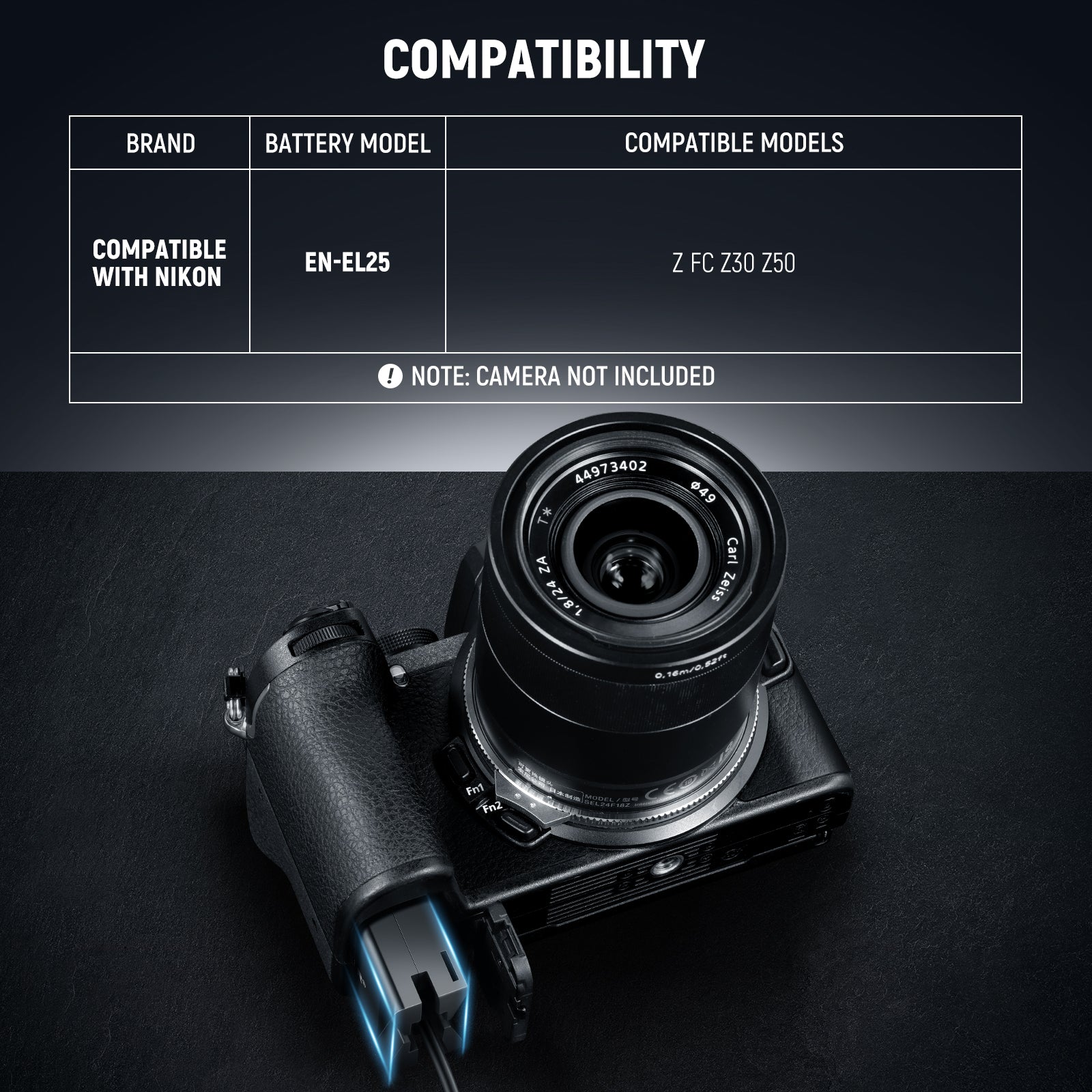 - Compatible Device Models- This dummy battery is a replacement battery for Nikon EN-EL25, and is fully compatible with Nikon Z fc Z30 Z50 cameras