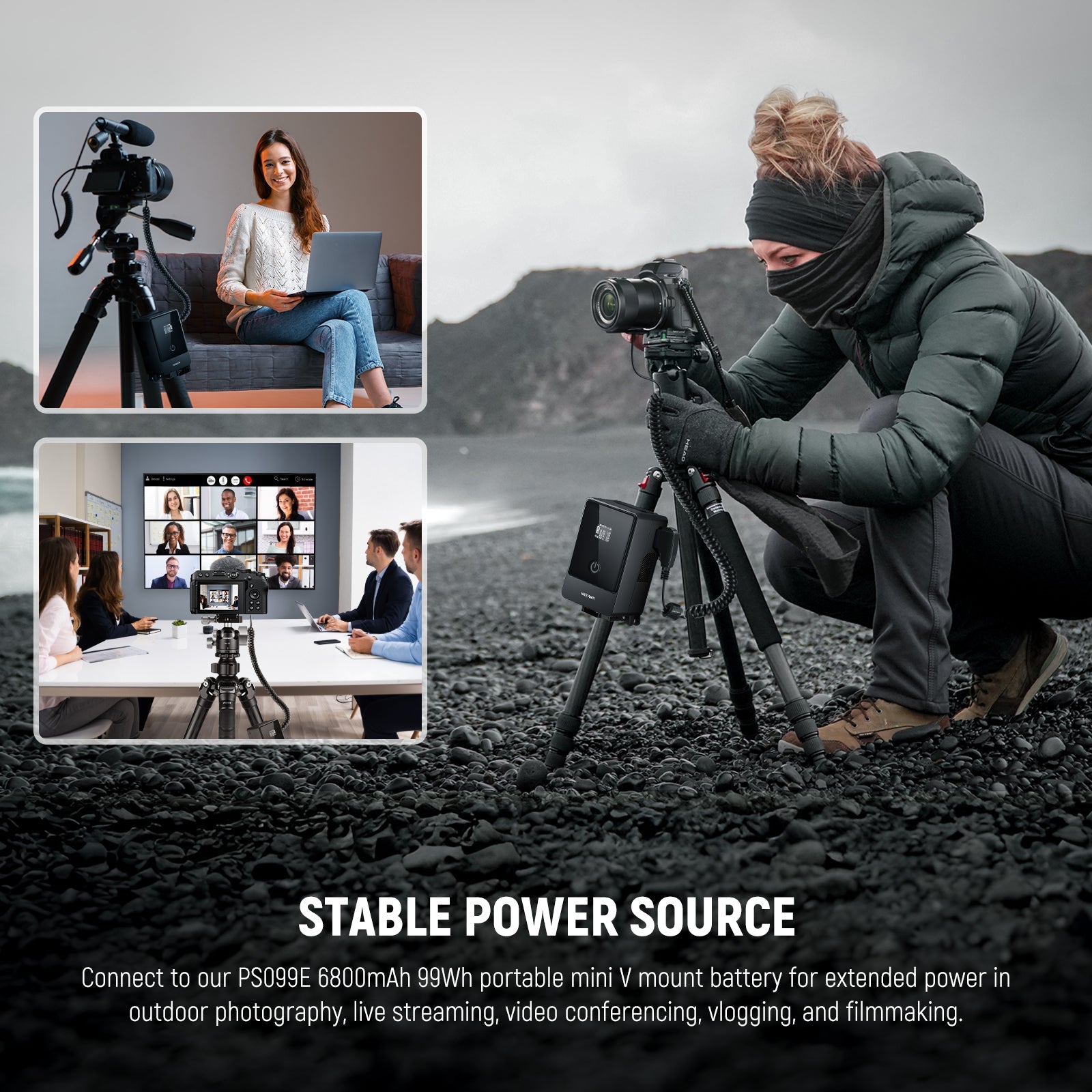 - Stable Power for Longer, Safer Footage- Say farewell to cable failures and safeguard your critical footage. Our intelligent chip guarantees a constant and stable power supply for your creation. Connect to our PS099E 6800mAh 99Wh portable mini V mount battery for extended power in outdoor photography, live streaming, video conferencing, vlogging, and filmmaking