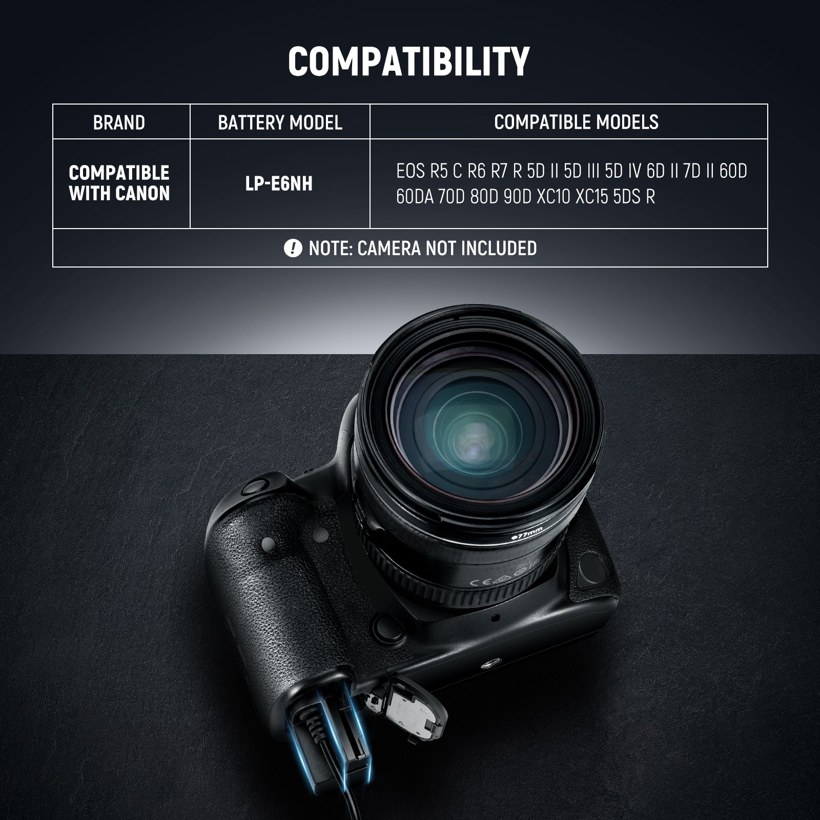 - Compatible Device Models- This dummy battery is a replacement battery for Canon LP-E6NH, and is fully compatible with Canon EOS R5 C R6 R7 R 5D II 5D III 5D IV 6D II 7D II 60D 60Da 70D 80D 90D XC10 XC15 5DS R cameras that accept LP-E6NH LP-E6N LP-E6 batteries