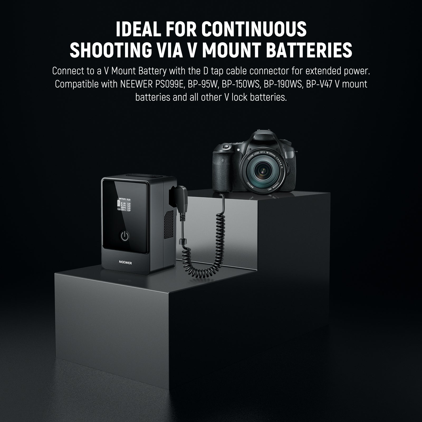 - Ideal for Continuous Shooting Via V Mount Batteries- With a D tap cable connector, it can work with NEEWER PS099E, BP-95W, BP-150WS, BP-190WS, BP-V47 V mount batteries and all other V lock batteries. Compatible with SmallRig v mount battery Series, compatible with Sony BP-U65 BP-U68 BP-U100 BP-U90 V mount batteries
