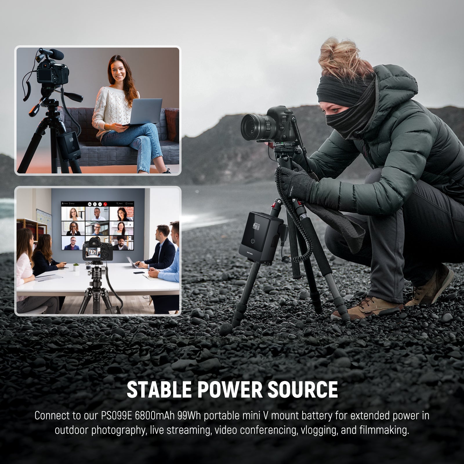 - Stable Power for Longer, Safer Footage- Say farewell to cable failures and safeguard your critical footage. Our intelligent chip guarantees a constant and stable power supply for your creation. Connect to our PS099E 6800mAh 99Wh portable mini V mount battery for extended power in outdoor photography, live streaming, video conferencing, vlogging, and filmmaking