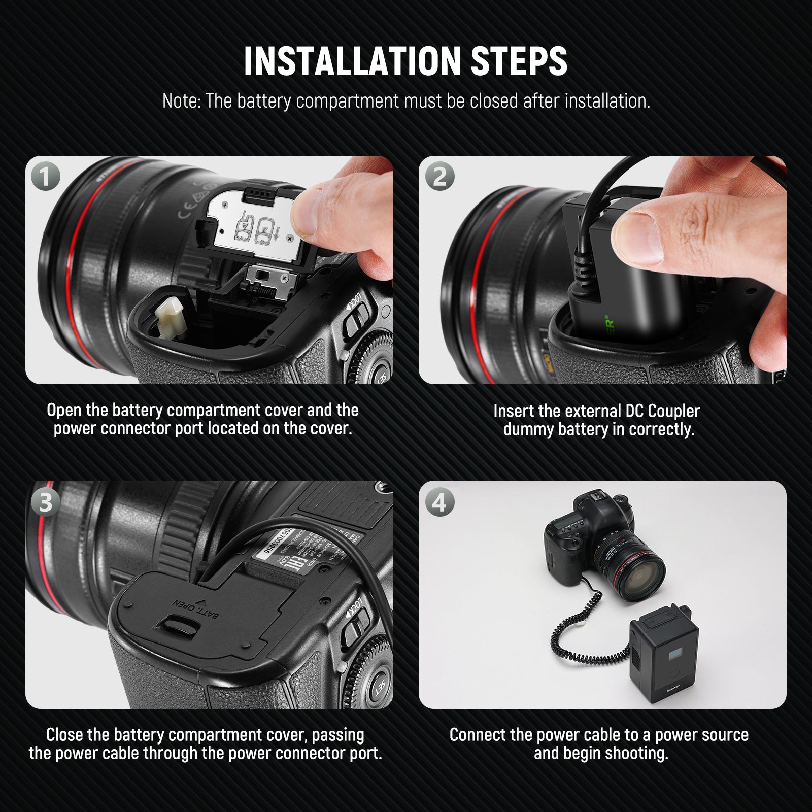 - 1 x LP-E6NH to D Tap Dummy Battery