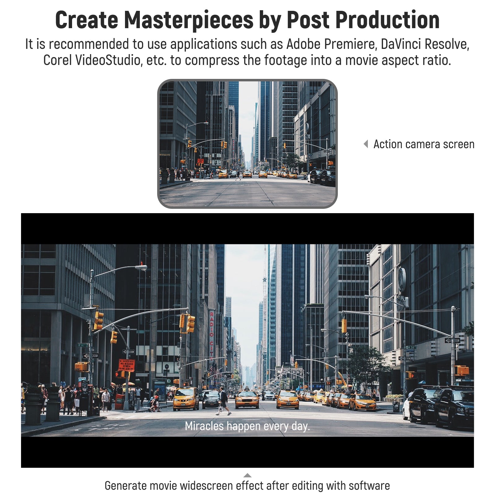 - Use with Camera App- Use a Camera App to unsqueeze the footage captured by your action camera into a cinematic aspect ratio. Otherwise, it can't generate a widescreen screen directly. Recommended to use Adobe Premiere, DaVinci Resolve, Corel VideoStudio, etc.