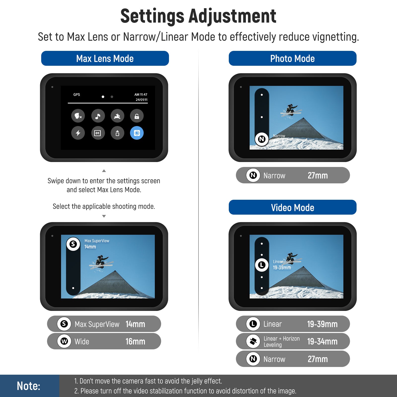 - 1.2x Compression for Immersive Widescreen- NEEWER 1.2x anamorphic lens is seamlessly compatible with hero 12 11 10 9. It offers a wider field of view for more scenes to be framed, creating enticing movie footage like a Hollywood blockbuster. Note 1: Do not move the camera too fast to avoid the jelly effect. Note 2: Please turn off the video stabilization function to avoid distortion of the image
