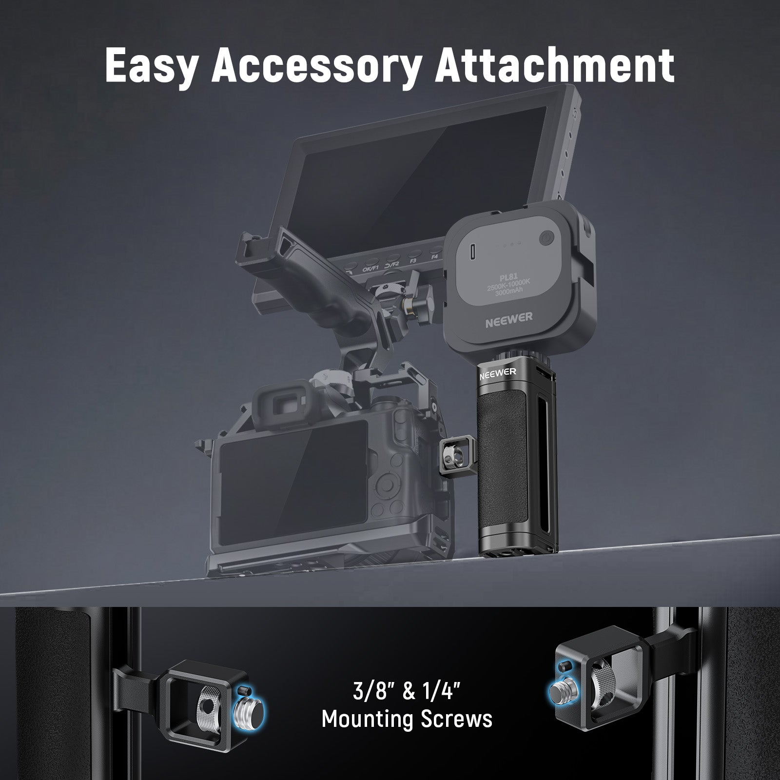 - Multiple Mounting Points- With 1/4" threads and a cold shoe, this camera cage side handle can mount several accessories for expanded functions. You can separately purchase our CM14 Pro Mini Microphone, PL81/RGB62 LED Video Light, ST25 Magic Arm, and T30 Flexible Tripod for a versatile and professional video rig