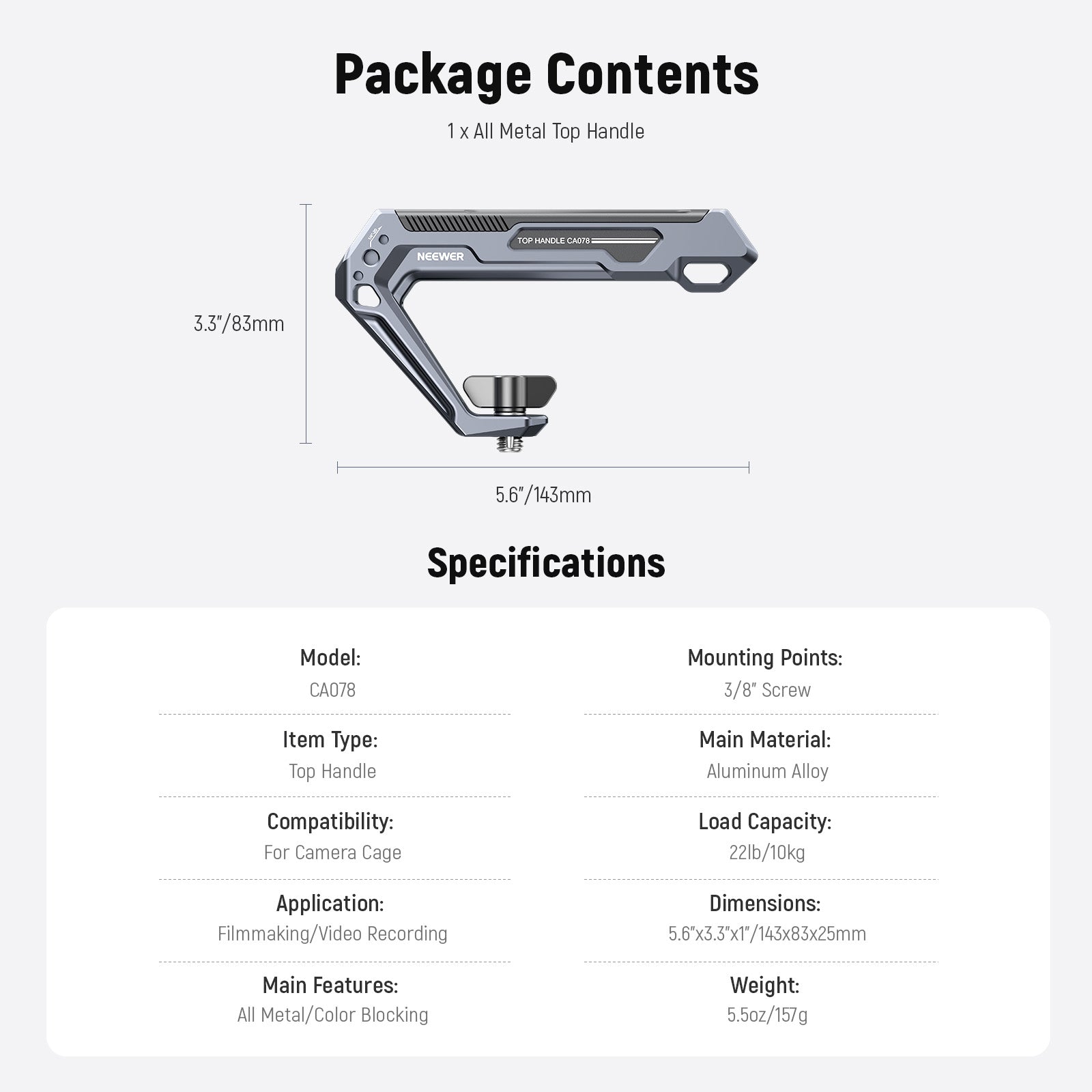- Stylish Color Blocking Design- A perfect combination of functionality and aesthetics, NEEWER CA078 Camera Top Handle adopts a black and steel blue color blocking design for a sleek and chic look