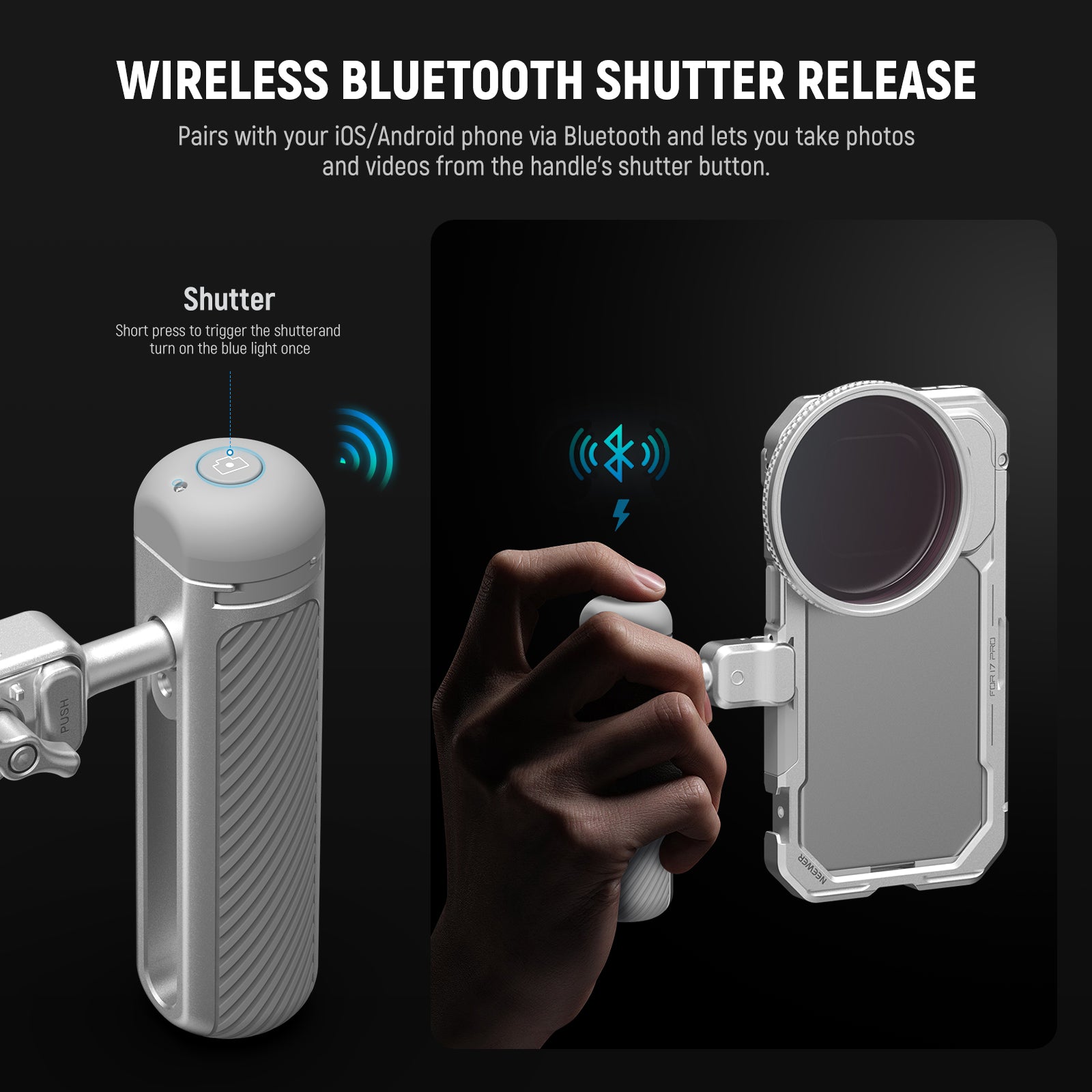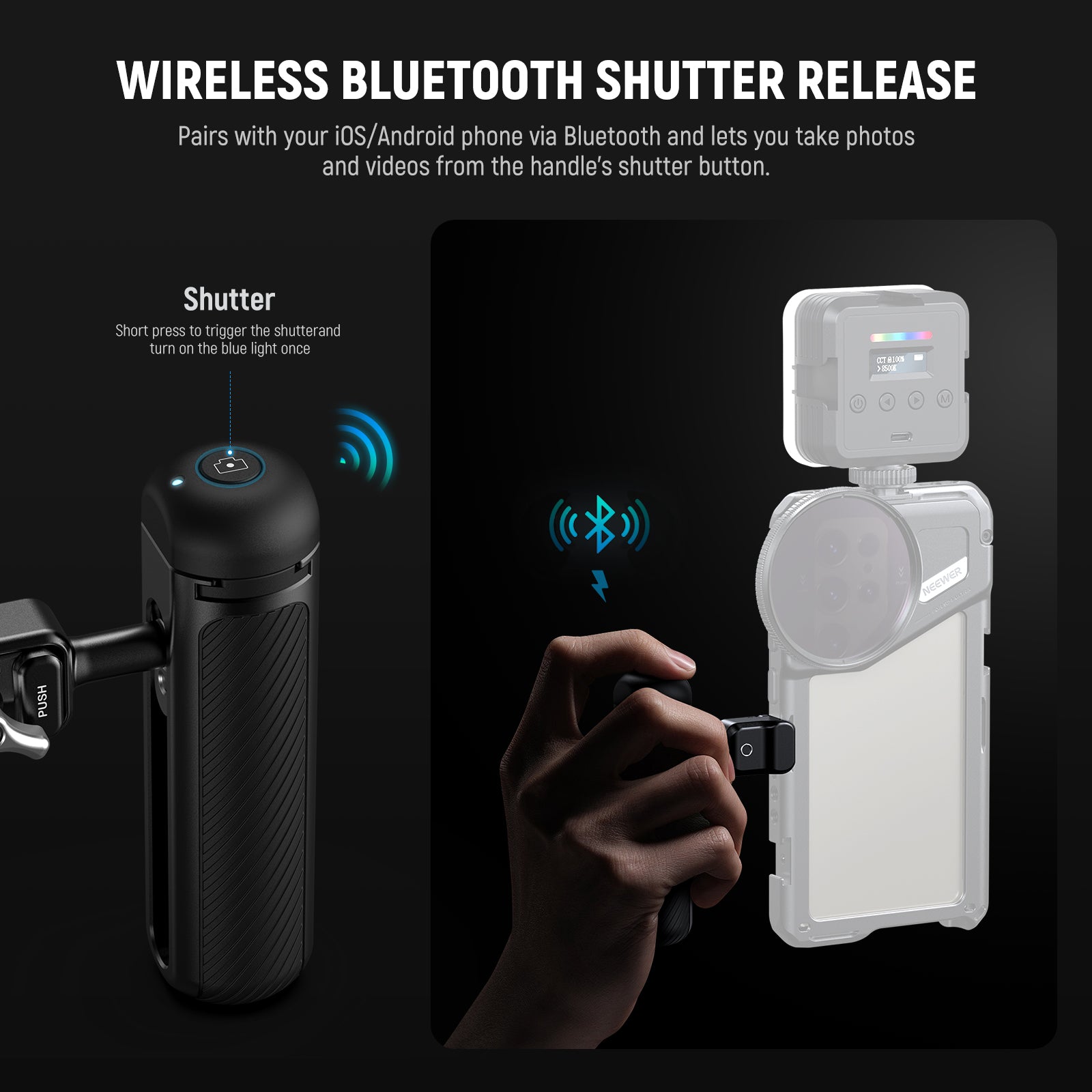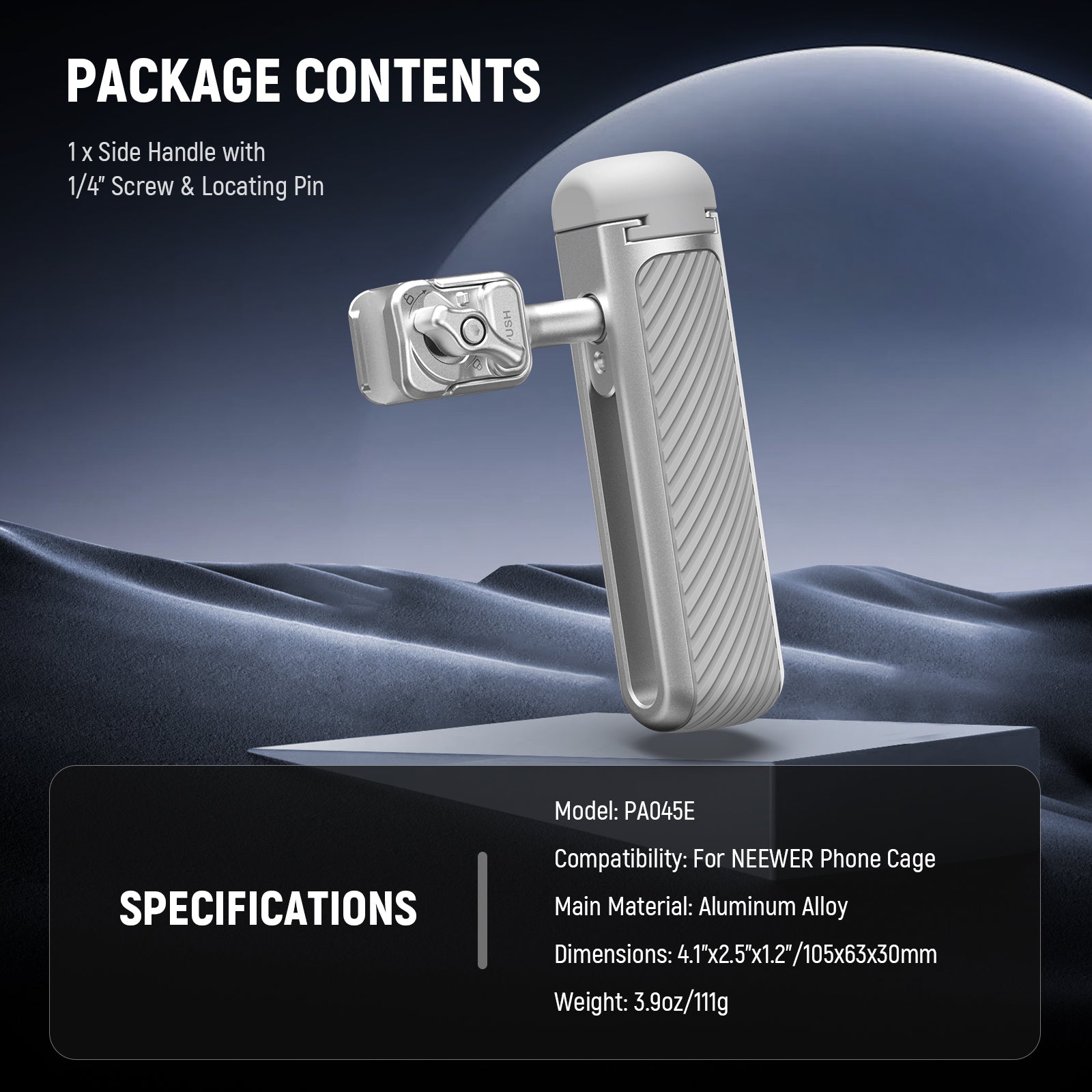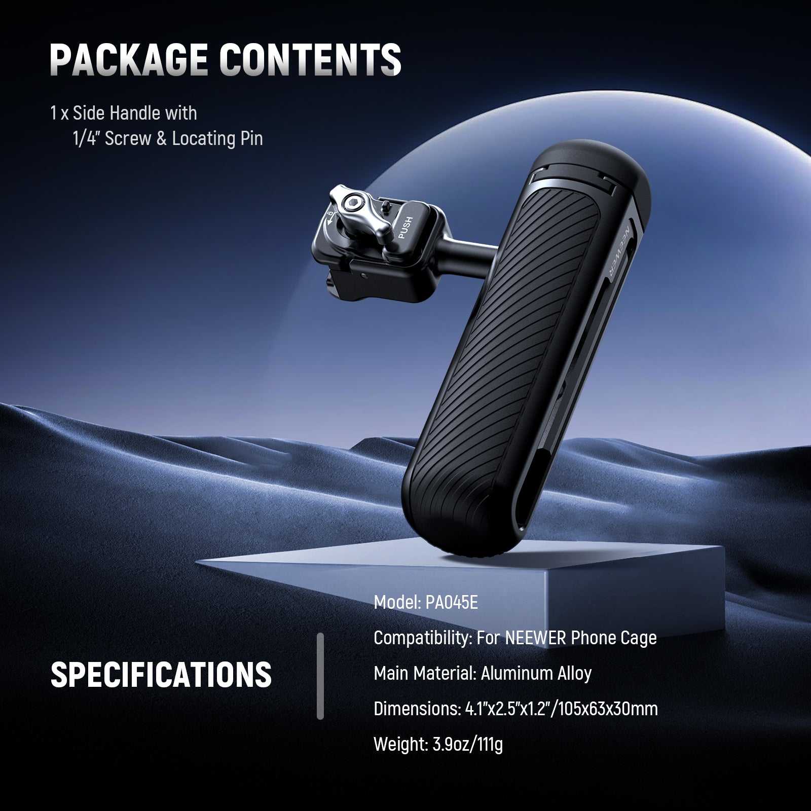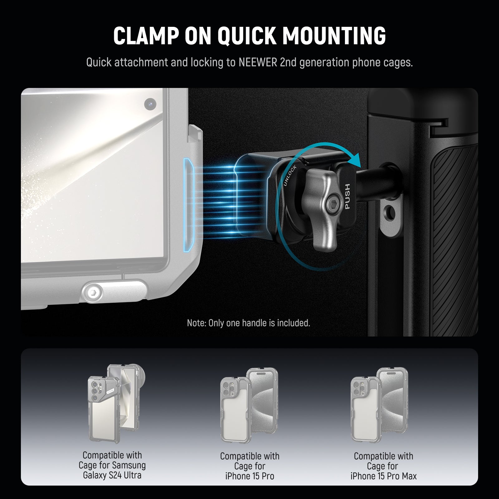 For NEEWER 2nd Gen Phone Cages- This side handle with Bluetooth shutter is designed for NEEWER phone cages with quick release clamp mounting slots, including PA143/PA144 for iPhone 17 Pro/Pro Max, PA073/PA074 for iPhone 16 Pro/Pro Max, PA043/PA044 for iPhone 15 Pro/Pro Max, and PA042 for Samsung Galaxy S24 Ultra