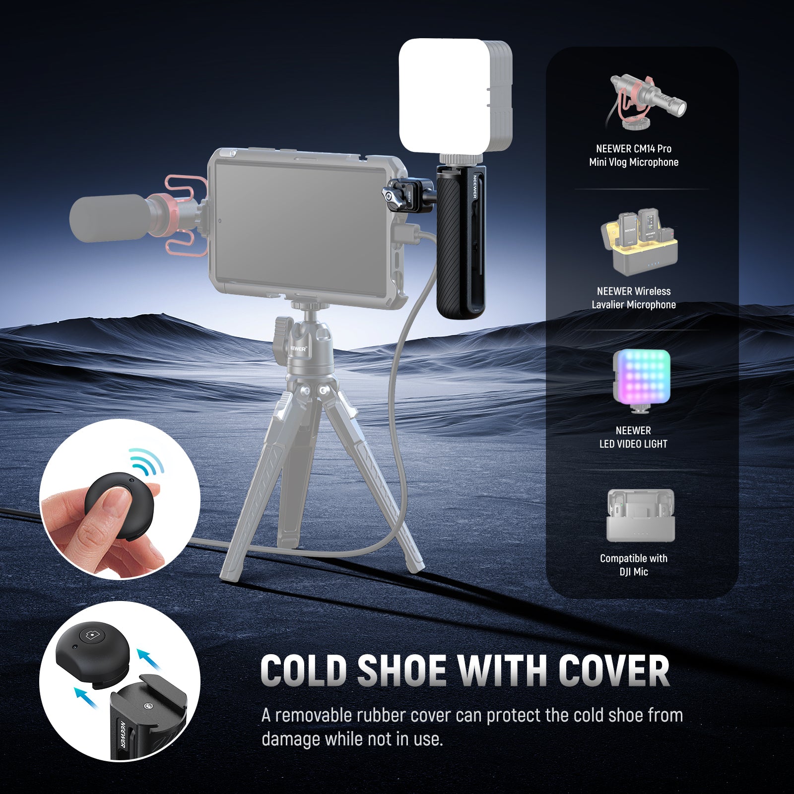 - Cold Shoe Mount with Anti Off Pin- The cold shoe has a retractable anti off pin to prevent the accessory from falling, compatible with DJI Mic and NEEWER CM14 Pro Microphone, CM22/CM28 Wireless Lavalier Microphone, and PL81/RGB62 LED Video Light. Note: Remove the shutter release module before using the cold shoe