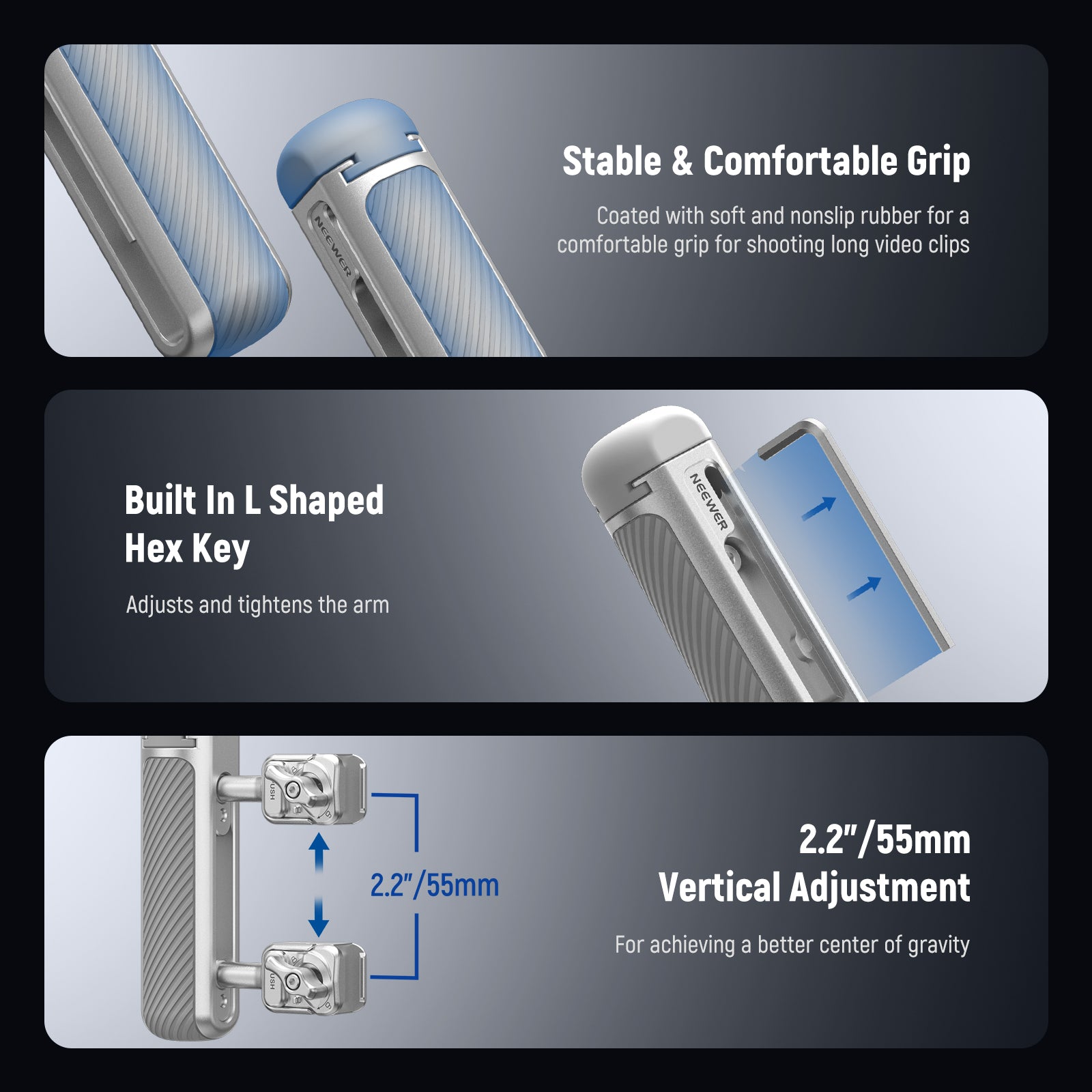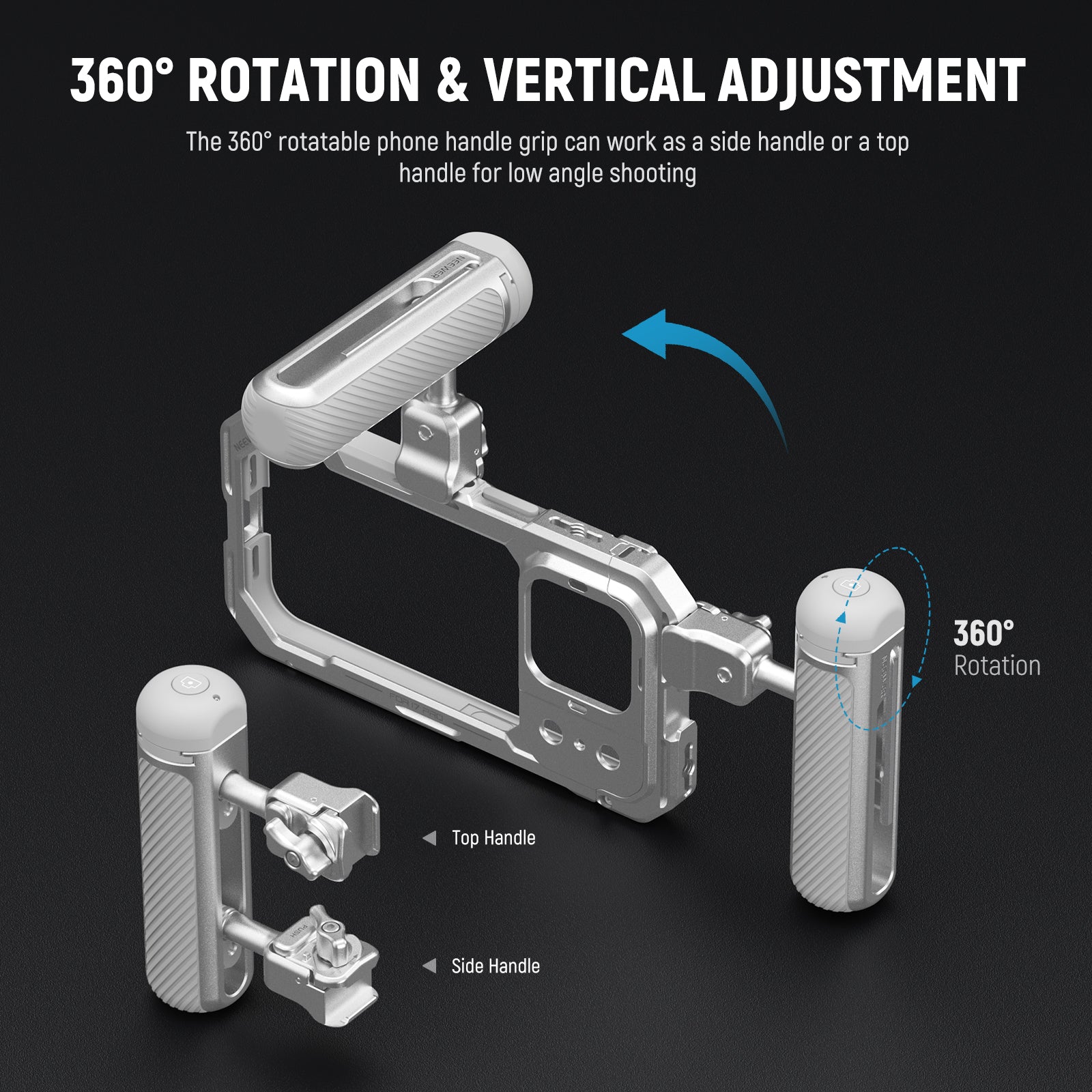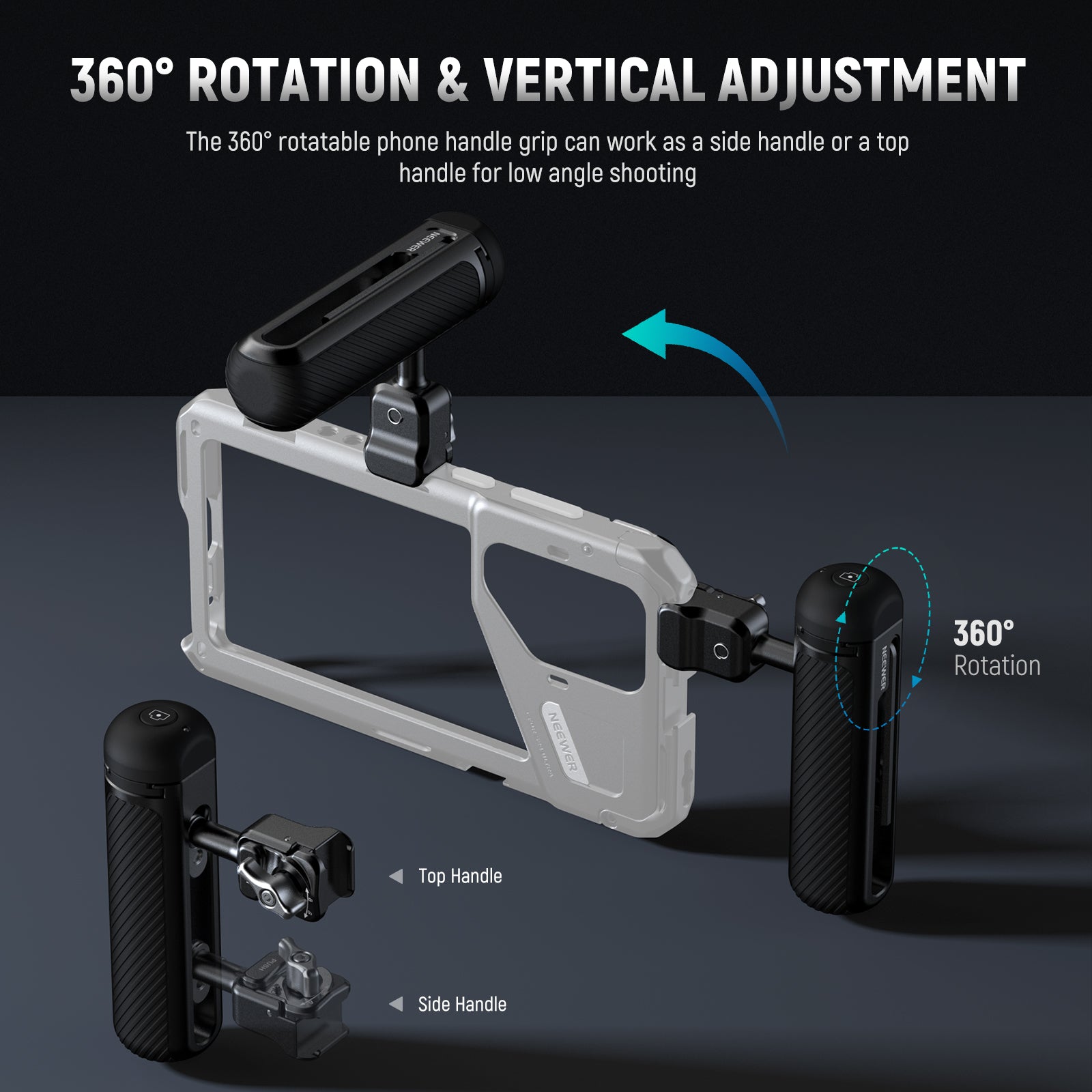 - 360° Swivel & Vertical Adjustment- With 360° rotation, the phone handle grip can double as a top handle for low angle shots. 2.2"/55mm vertical adjustment allows improved balancing
