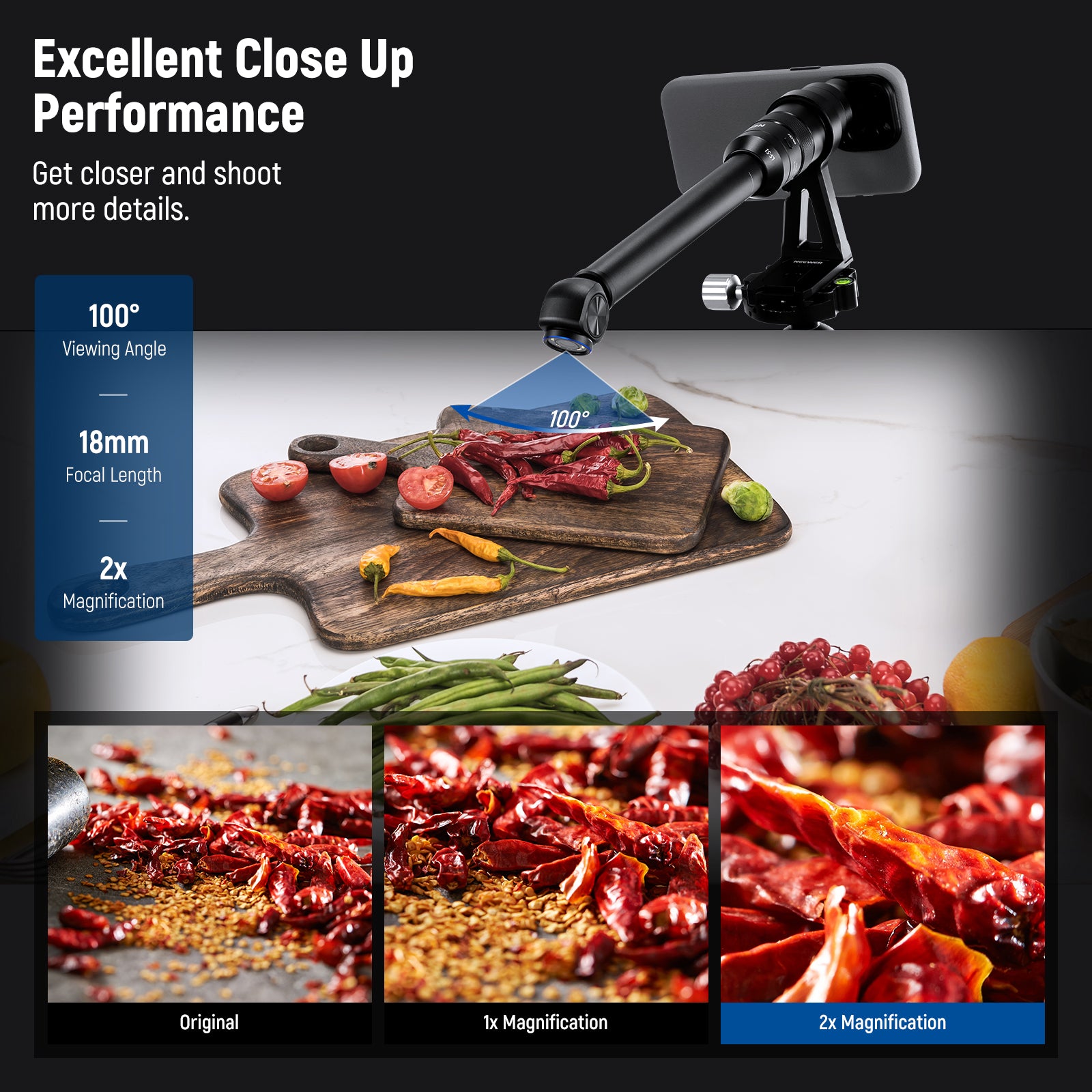 - 2x Magnification & Wider 100° Field of View- Featuring a terrific 2x magnification for close up shooting, this macro phone lens allows you to catch stunning details of the subject, ideal for photographing miniature models, food, animals, etc. Combined with the 100° larger field of view, it allows you to include a larger area or more subjects in your frames when getting detailed macro shots
