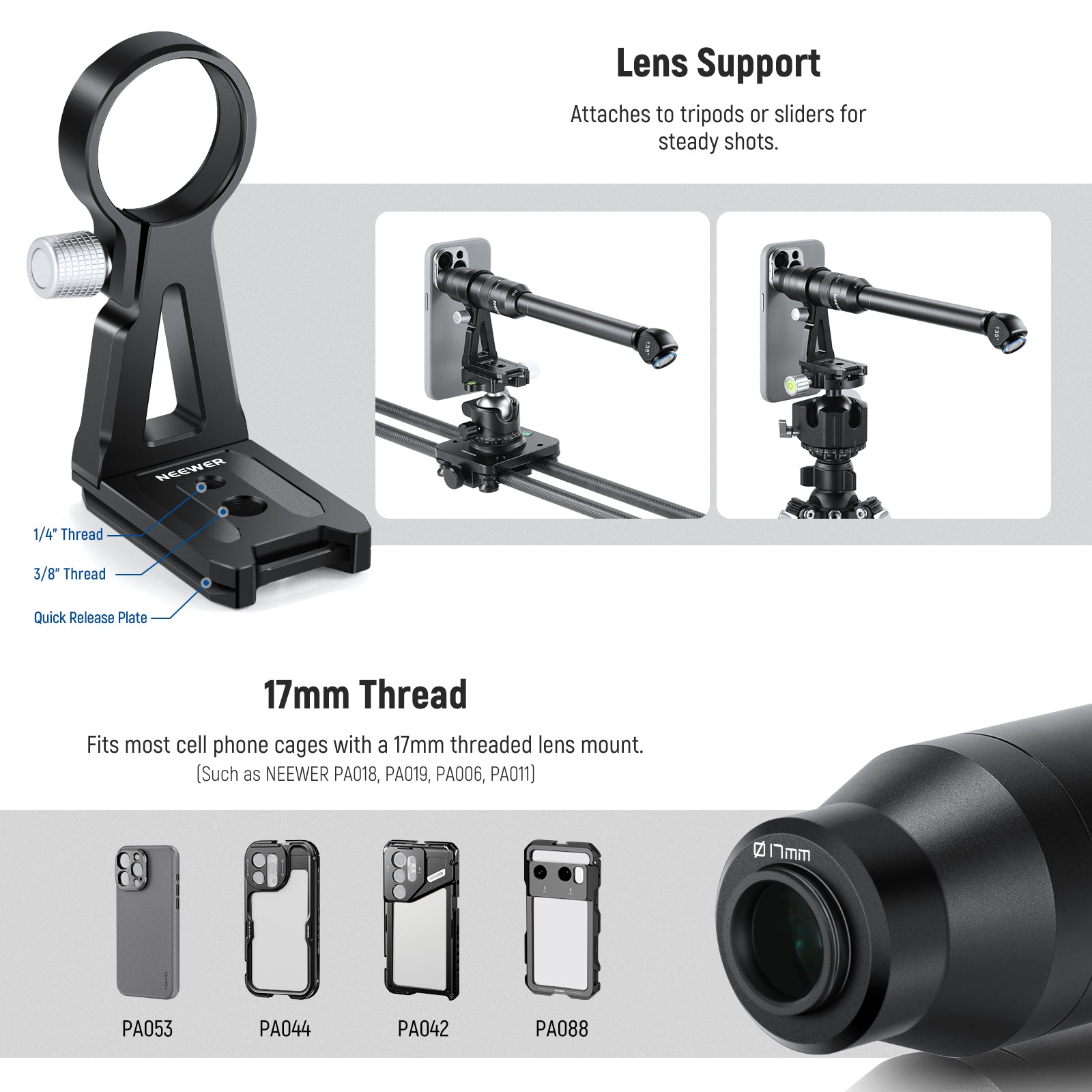 - Versatile Lens Support Bracket-Â Includes a phone lens support bracket with an Arca style base, a 1/4" threaded hole, and a 3/8" threaded hole for enhanced compatibility. It allows you to connect the phone lens to a rail or tripod for more stable and creative use