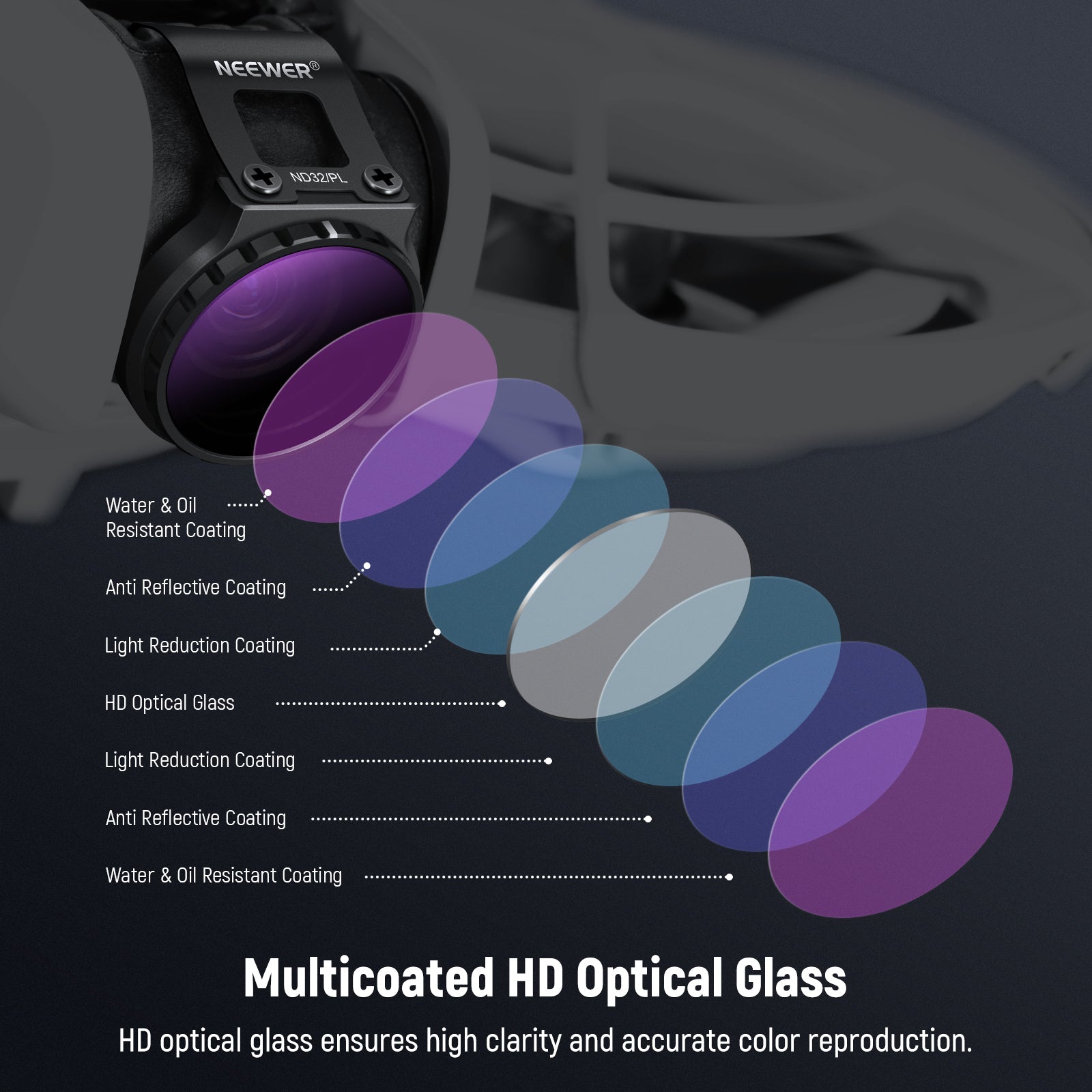- Multi-layer HD Optical Glass- HD optical glass ensures high clarity and accurate color reproduction. Multiple coatings on both sides of the glass are resistant to water, fingerprints, stains and scratches, making the filters easy to clean