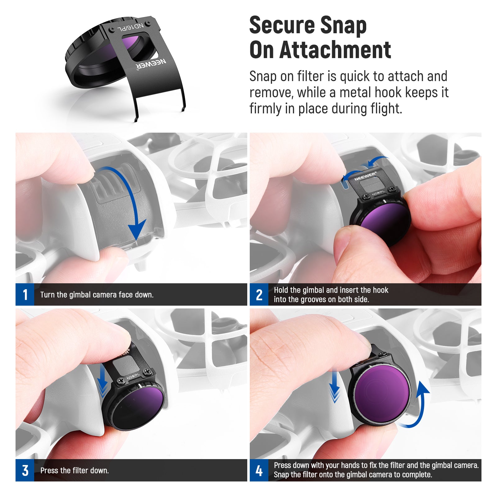- Secure Snap Fastening- The snap-on design ensures quick attachment and quick removal, while a hook holds the filter securely in place during flight. Thin and lightweight metal frame prevents vignetting and does not compromise the use of the gimbal protector