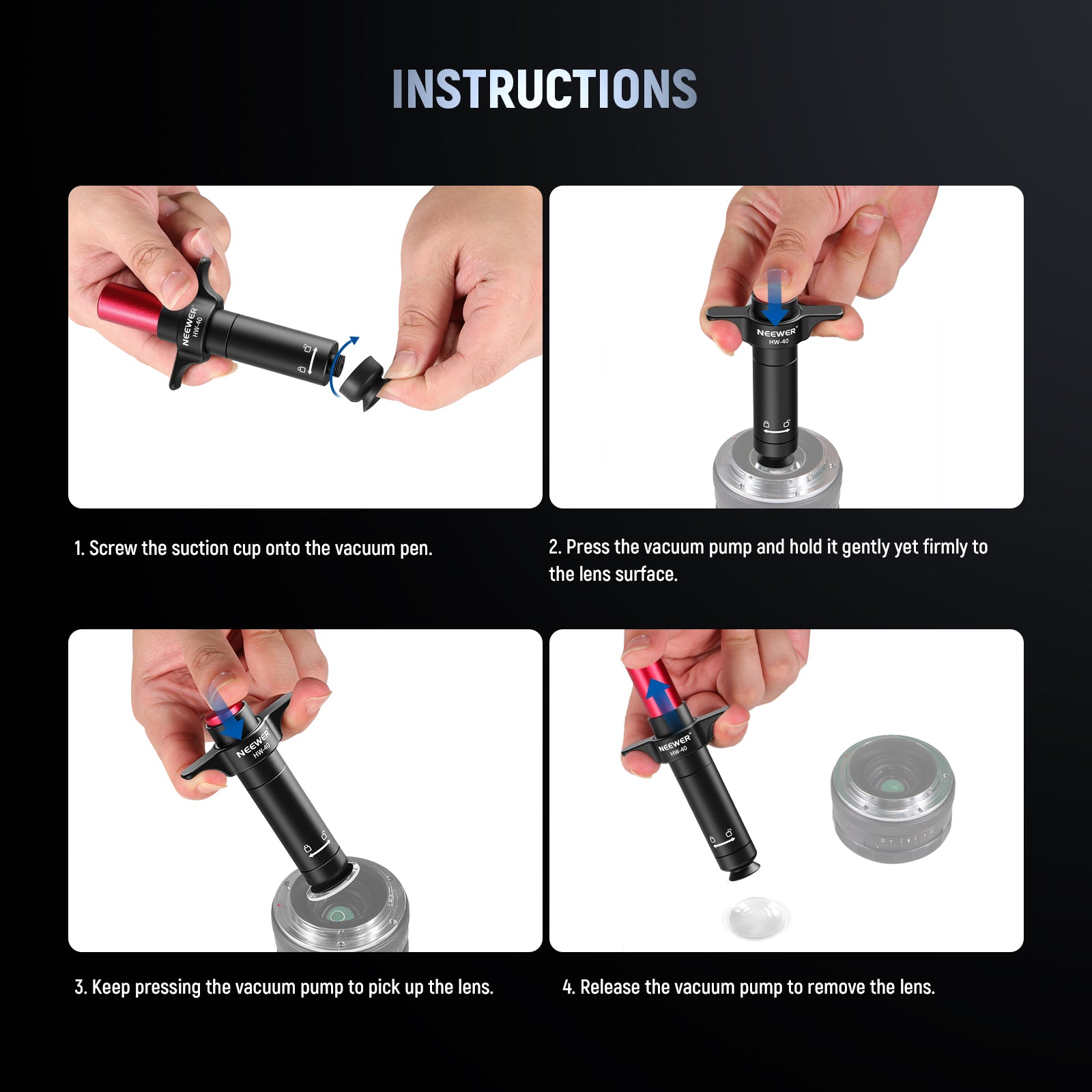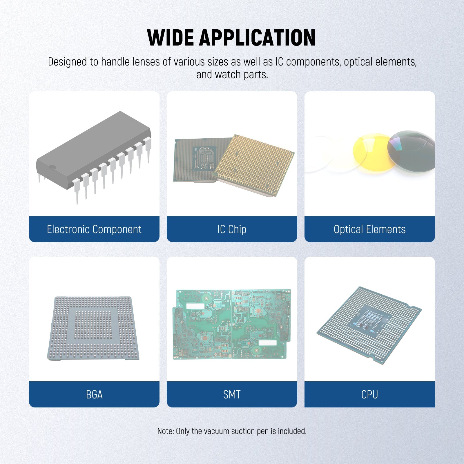 - High Vaccum Suction Power- The vacuum pen and suction cups provide adequate suction power. Press the vacuum pump to suck the surface of the lens, pick it up gently, then release to make the item fall in the correct position. Note: Keep the pump pressed during the whole process to ensure secure suction