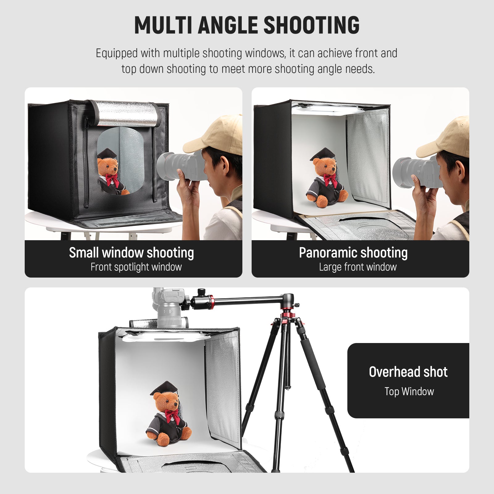 • Multiple Shooting Angles- The front panel of the photography tent has 2 openings for horizontal shooting with minimized outside reflections, contributing to capturing the perfect features and beauty of your products. Plus, there is a top opening for bird’s eye view photos