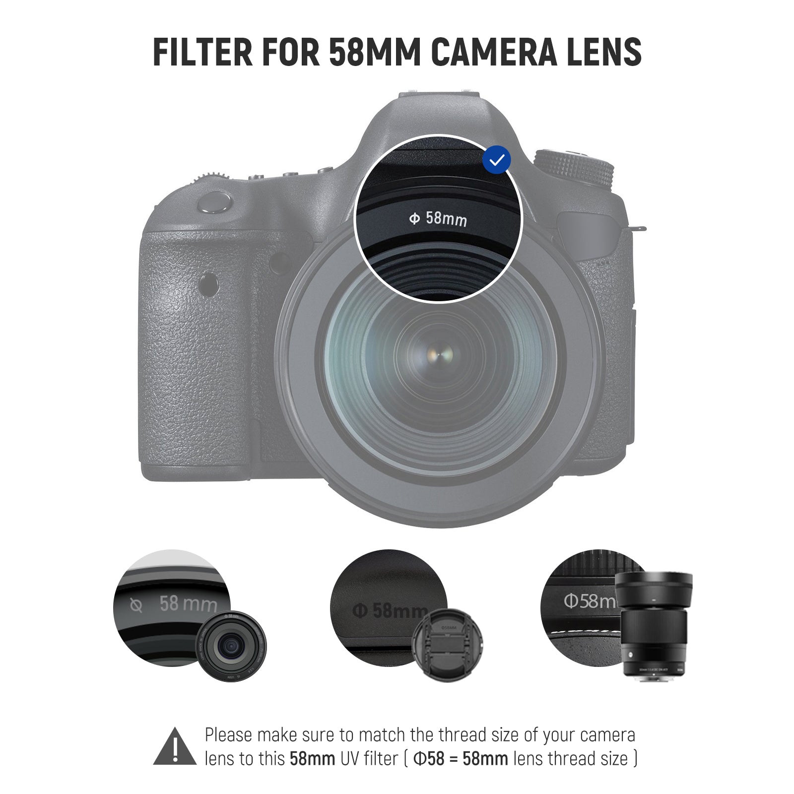 - Choose the Correct Filter Size- This range of HD UV filters comes in different sizes. For example, the 58mm filter can only work with a 58mm camera lens. Please make sure to match the thread size of your camera lens to the UV filter (Φ58 = 58mm lens thread size). A carrying case is also included to store the filter safely