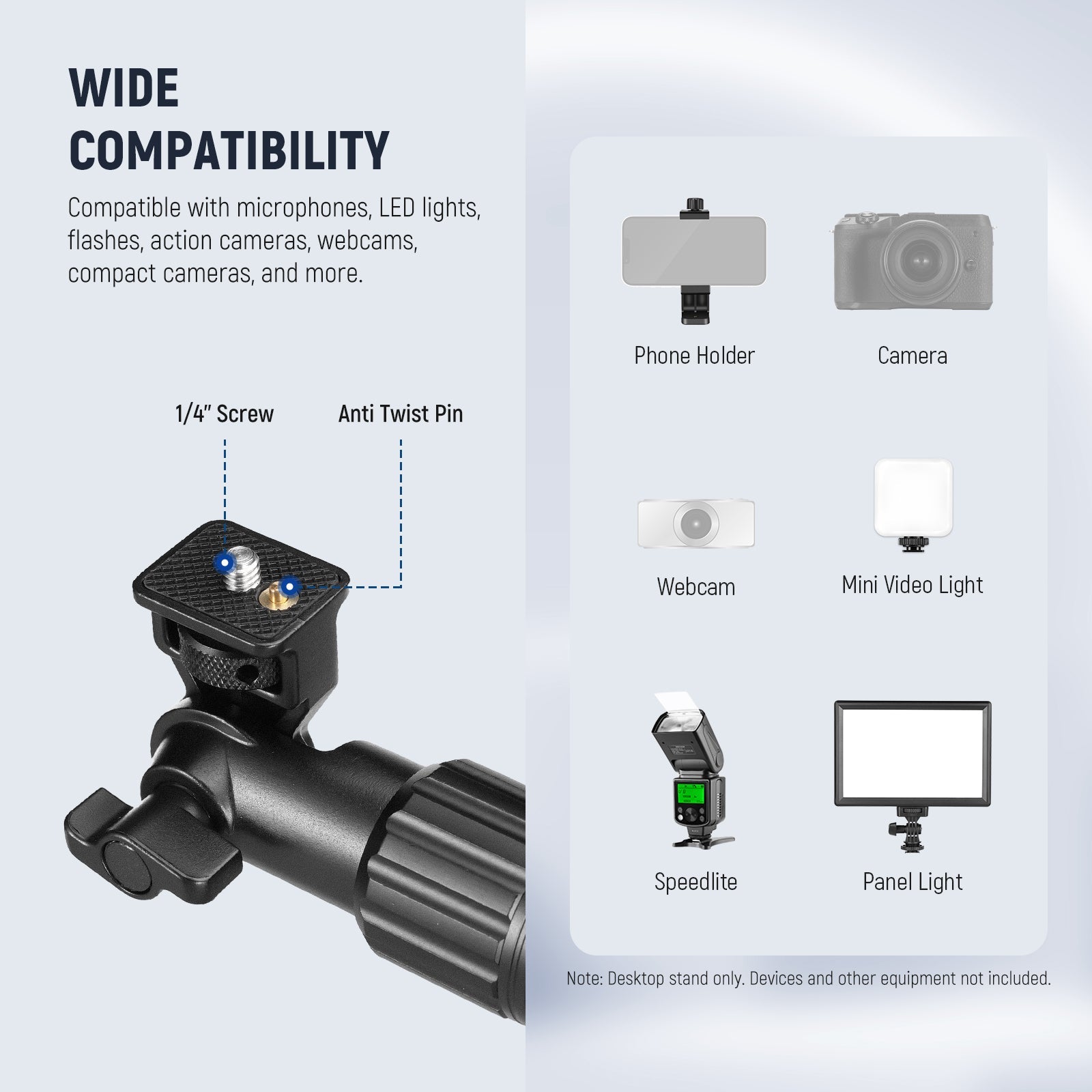 • Flexible Desk Stand Extension- With a length of 22"/56cm, this 2 section auxiliary holding arm is designed for horizontal installation on desk stands for overhead shots, providing flexibility to expand your setup for easy installation of cameras, webcams, fill lights, ring lights, or microphones. The desk camera mount arm also includes a phone clip to hold smartphones within 2.3"-3.3"/58-85mm