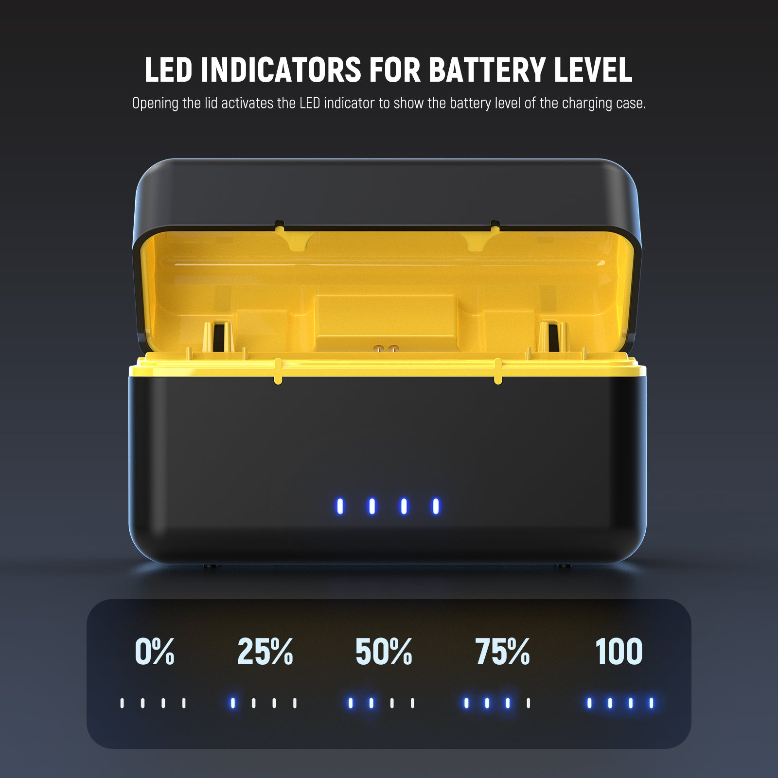 - Small Size, Smart Charging- It provides large power even with the small size. The fully charged charging case holds twice full charges for the CM28 and CM28 PRO transmitters and receiver in just 1.5 hours with a powerful 2000mAh battery capacity, enabling you to charge on the go. Automatically start charging after putting the TX and RX in the case. Automatically turn on the TX and RX when opening the lid, and turn off them when closing the lid