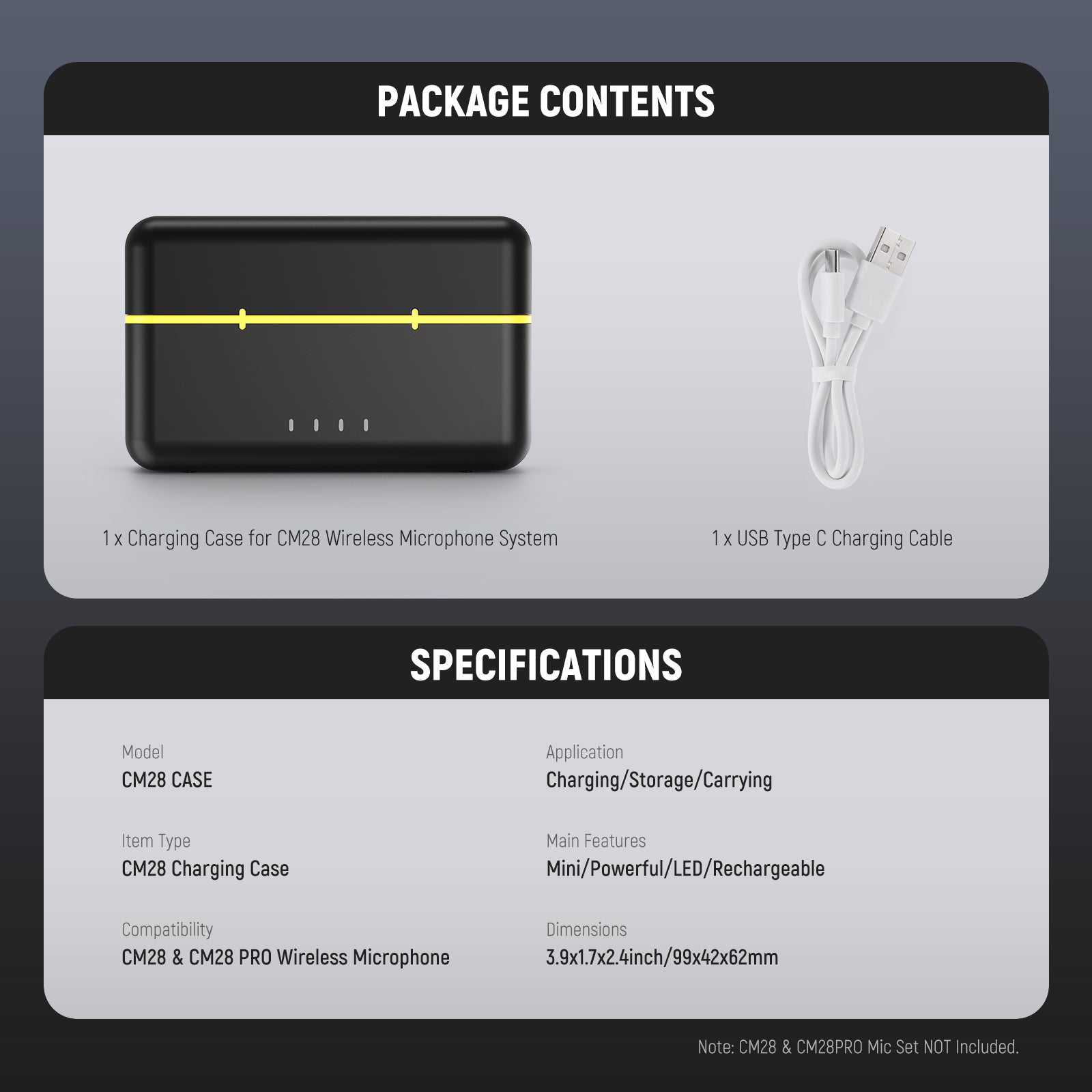 - Protective and Portable- This charging case measures 3.9x1.7x2.4inch (99x42x62mm), keeping your CM28 and CM28 PRO microphone system units safe, secure, and together while recharging them in this case between jobs. It is airline friendly and convenient to carry when traveling