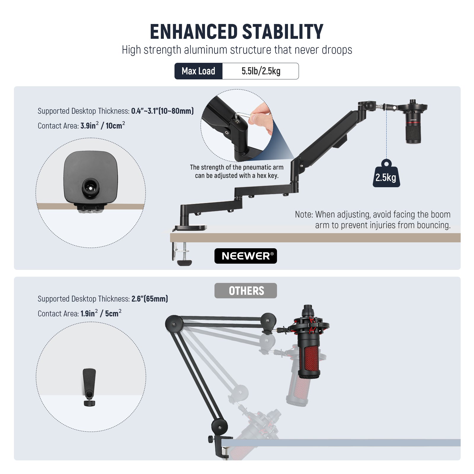 - Professional Pneumatic & Spring Loaded Boom Arm- Featuring an advanced pneumatic balancing system and integrated spring loads, the boom arm is engineered for swift and stable positioning, even with heavier microphones (rebound force is adjustable). It guarantees quiet, smooth microphone movement during video audio recording, live streaming, or broadcasting, with a maximum load capacity of 5.5lb/2.5kg. Note: When adjusting, avoid facing the boom arm to prevent injuries from bouncing.