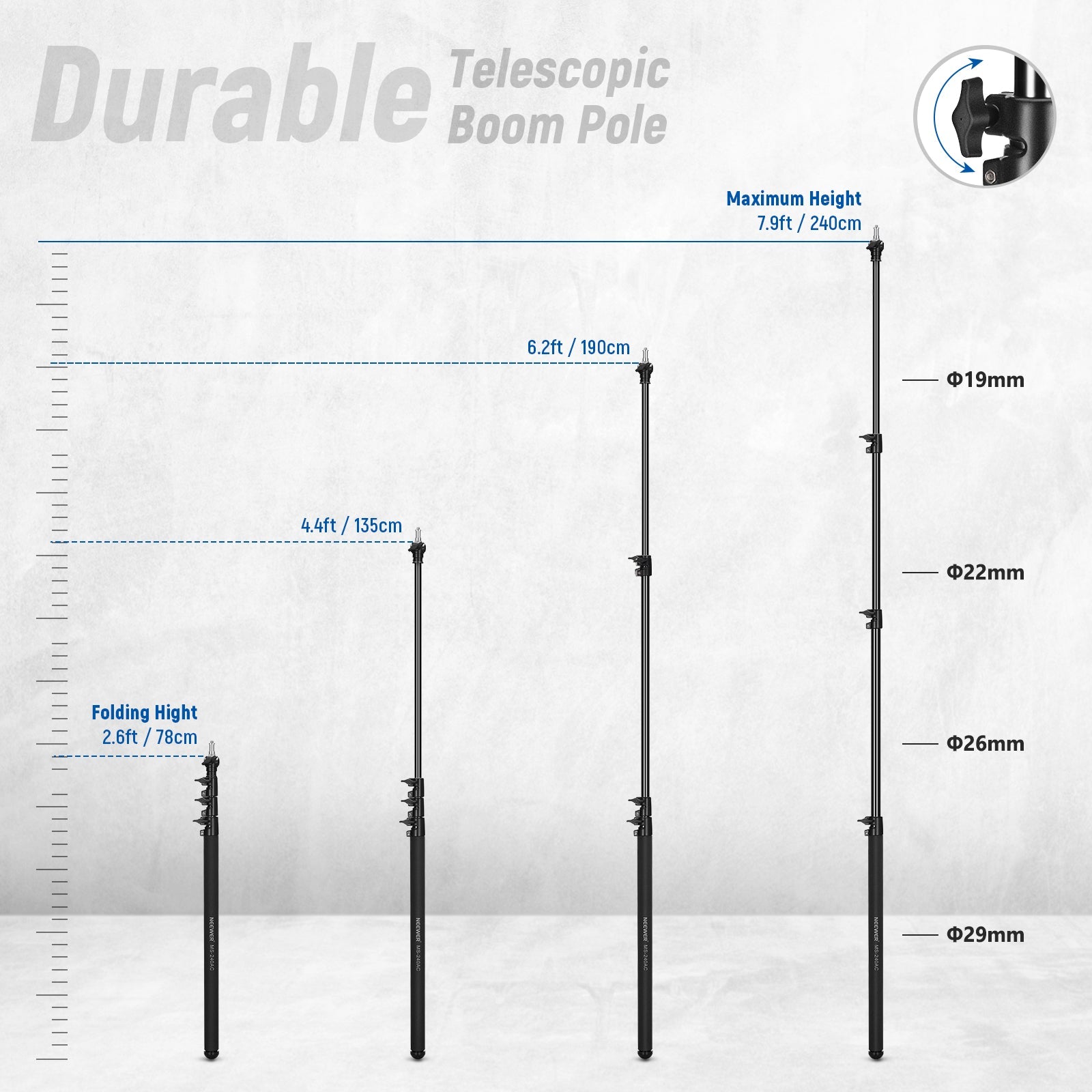 • Durable Telescopic Boom Pole- Fortified with 4 thick telescopic tubes (1.1"-1"-0.9"-0.7"/29-26-22-19mm), this durable handheld boom pole can extend from 2.6ft to 7.9ft (78 to 240cm), versatile for filmmaking, interviewing, outdoor photography, YouTube/TikTok vlogs, and other applications