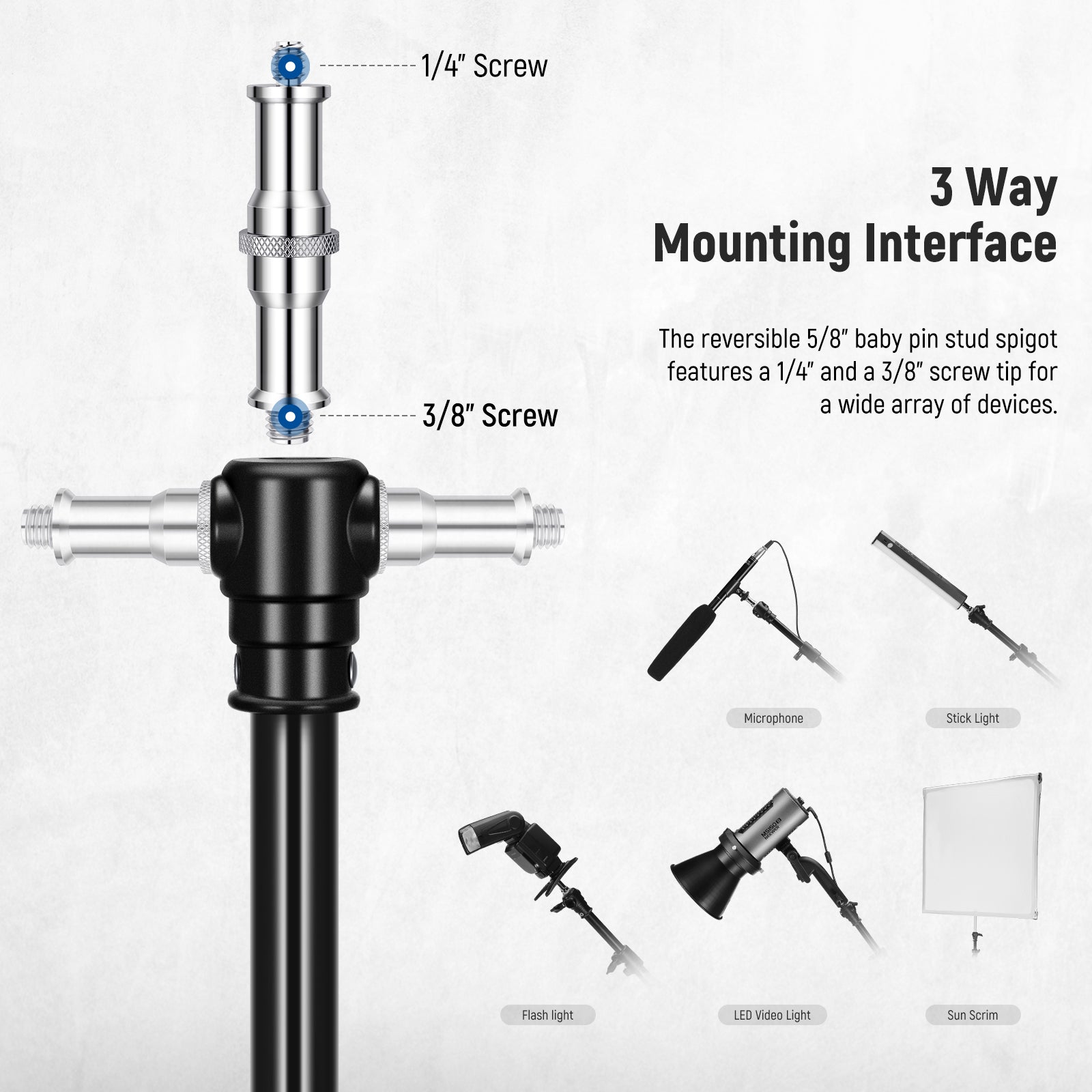 • 3 Way Mounting Interface- The reversible 5/8" baby pin stud spigot features a 1/4" and a 3/8" screw tip for a wide array of devices. Insert it into the mounting interface in 3 different positions as needed