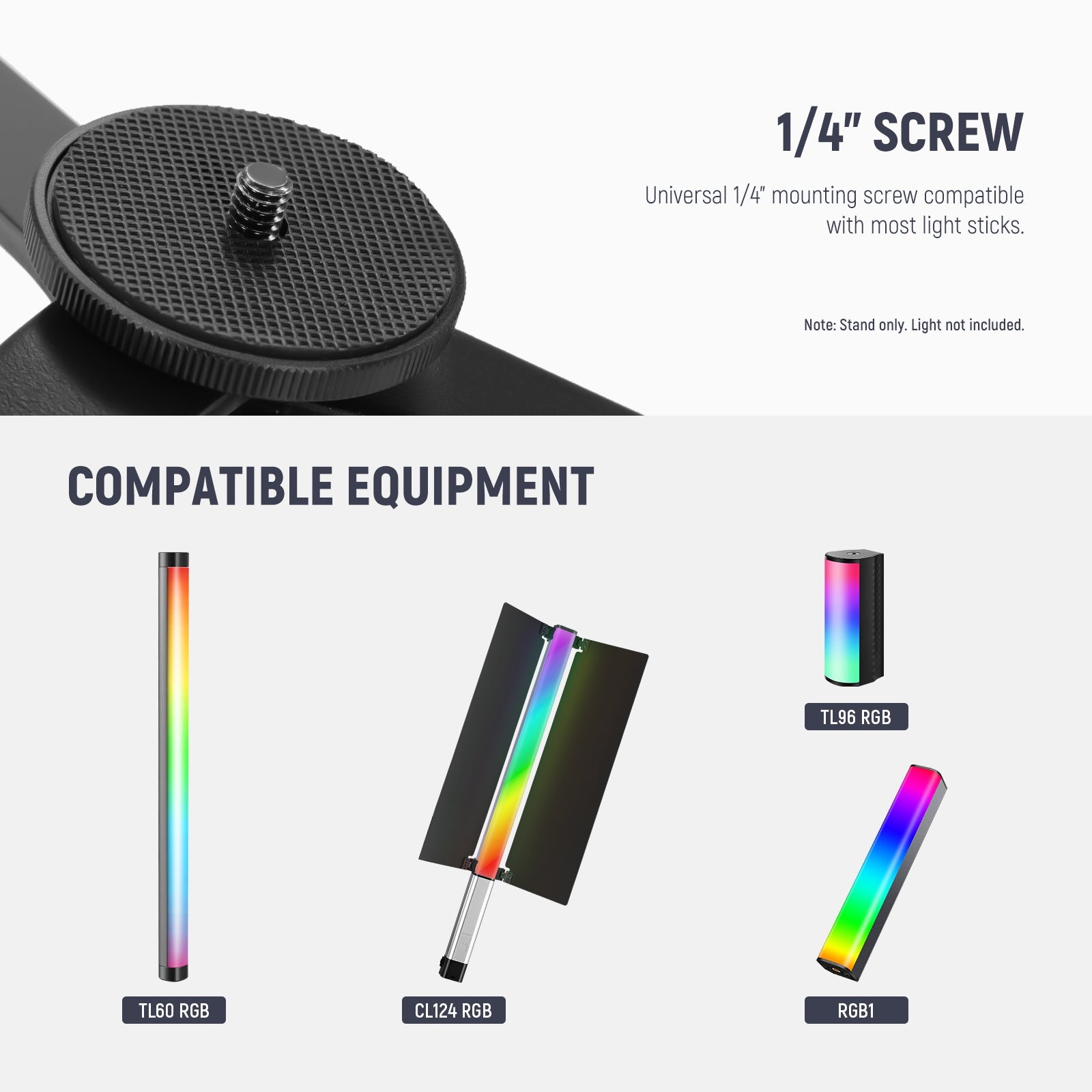 - Universal 1/4" Mounting Screw- With a universal 1/4" mounting screw, this desktop tripod stand is suitable for NEEWER TL60 tube light, RGB1 light stick, CL124 light wand, TL96 small light stick, and other mini LED lights with a 1/4" thread. It can work as a gimbal stand when connected to a gimbal stabilizer, or mount phone holders, action camera adapters, and vlogging cameras for video recording