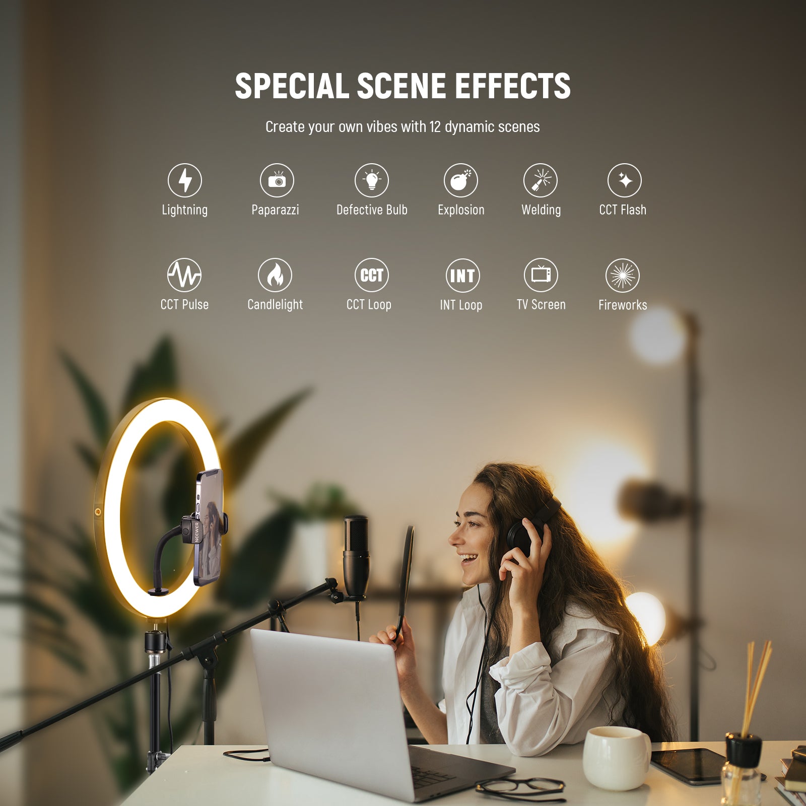 - CCT & FX Scene Effect Modes- CCT Mode offers 2900K-7000K warm and cool lighting along with 0-100% dimming. The flexibly adjustable lighting can flatter all skin tones, brighten your face, and minimize blemishes. FX Mode brings 12 realistic scene effects for professional video shooting. Use the wired controller to quickly get the effects you want