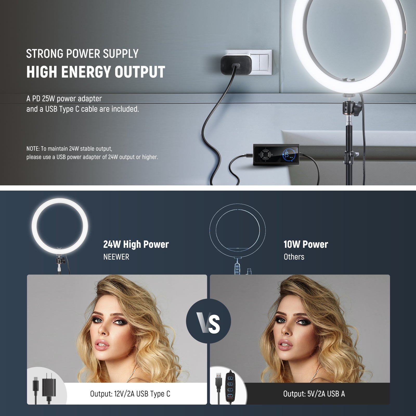 - PD 24W USB Type C Input- Connect the ring light to a wall socket through the included USB power adapter and USB Type C cable for convenient power supply. The power adapter supports PD 24W input for high energy