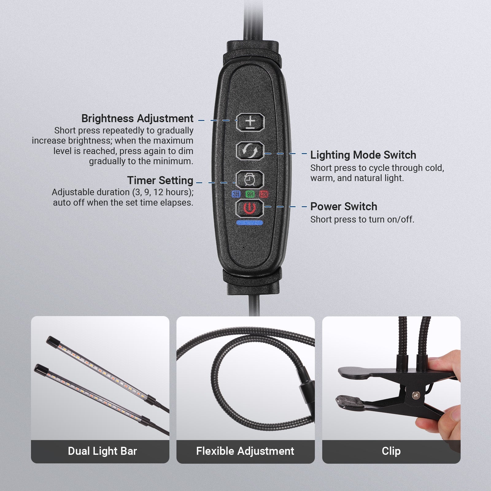 - Wide Coverage & Flexible Adjustment- Easily clamped onto the edge of a desk, the two 4.5" light bars with flexible arms extend up to 26.8" and can bend in any direction to cover more plants and promote their healthy growth