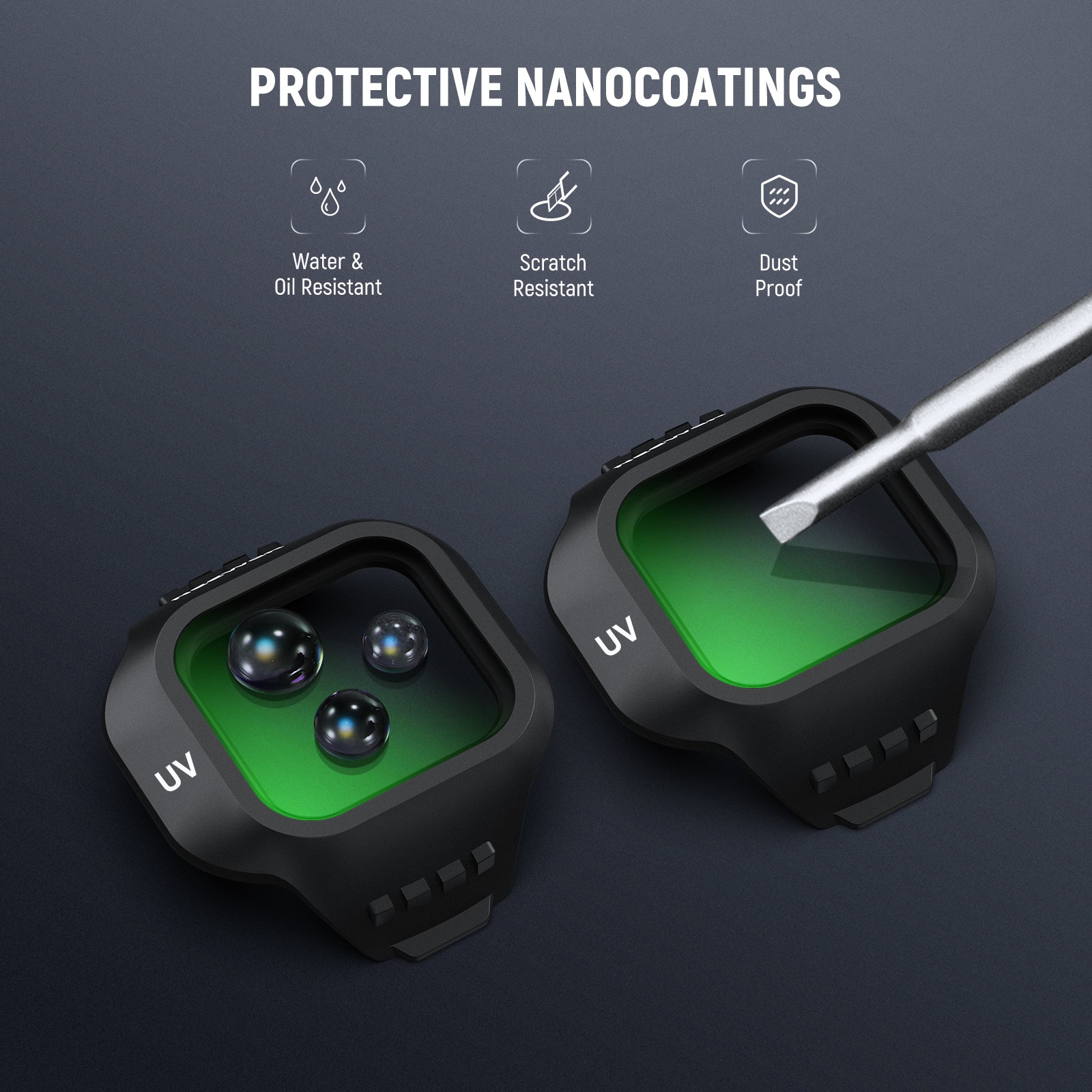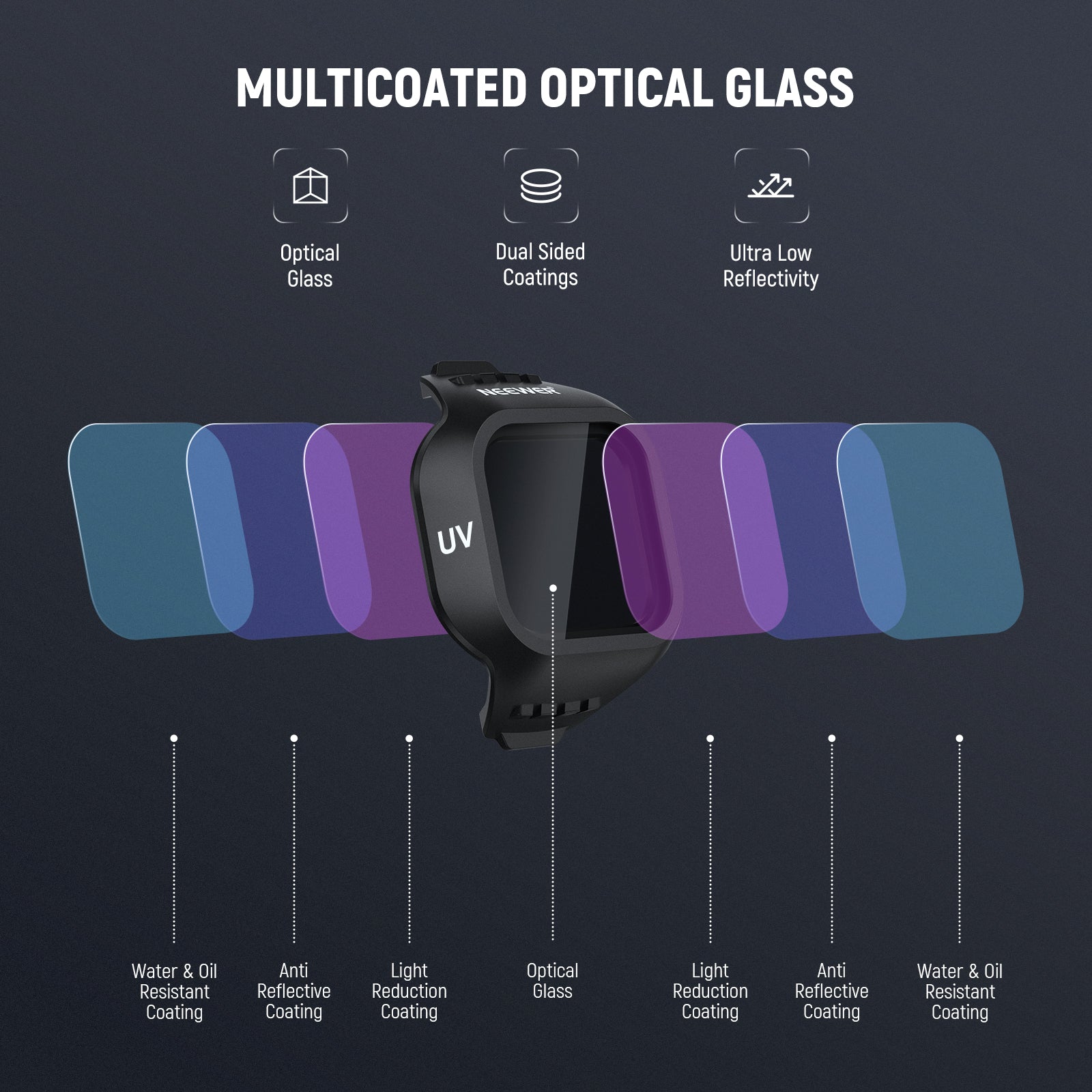 - Multicoated Optical Glass- Optical glass with multilayer, dual-sided coatings ensures clear footage while resisting water, fingerprints, and scratches. A cleaning cloth is included for daily care