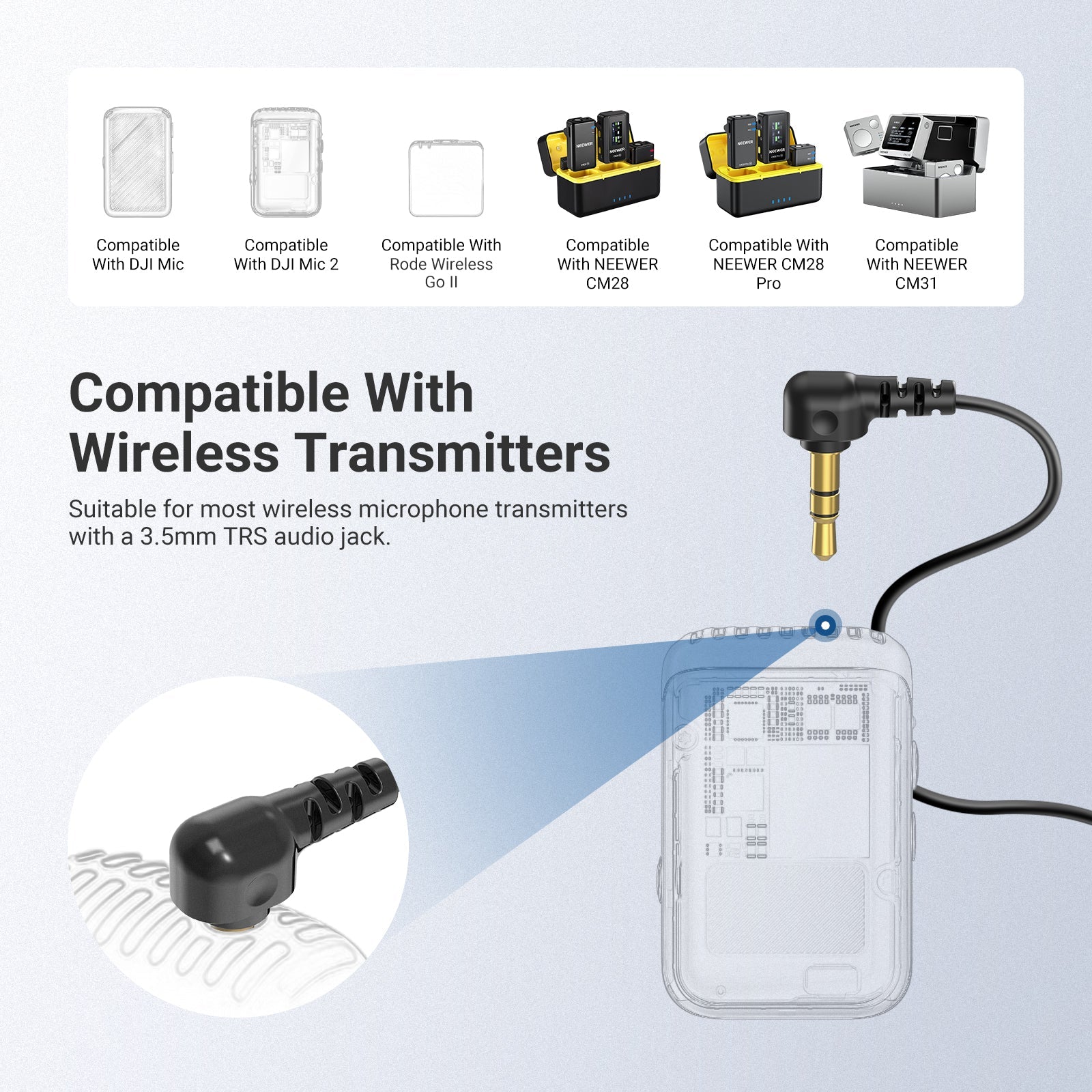 - Also for Wireless Transmitters- Compatible with DJI Mic, Mic 2, Mic Mini; compatible with Rode Wireless Go II; compatible with NEEWER CM28, CM28 Pro, CM28 Ultra, CM31, CM31 Pro, and other 3.5mm TRS wireless microphone transmitters