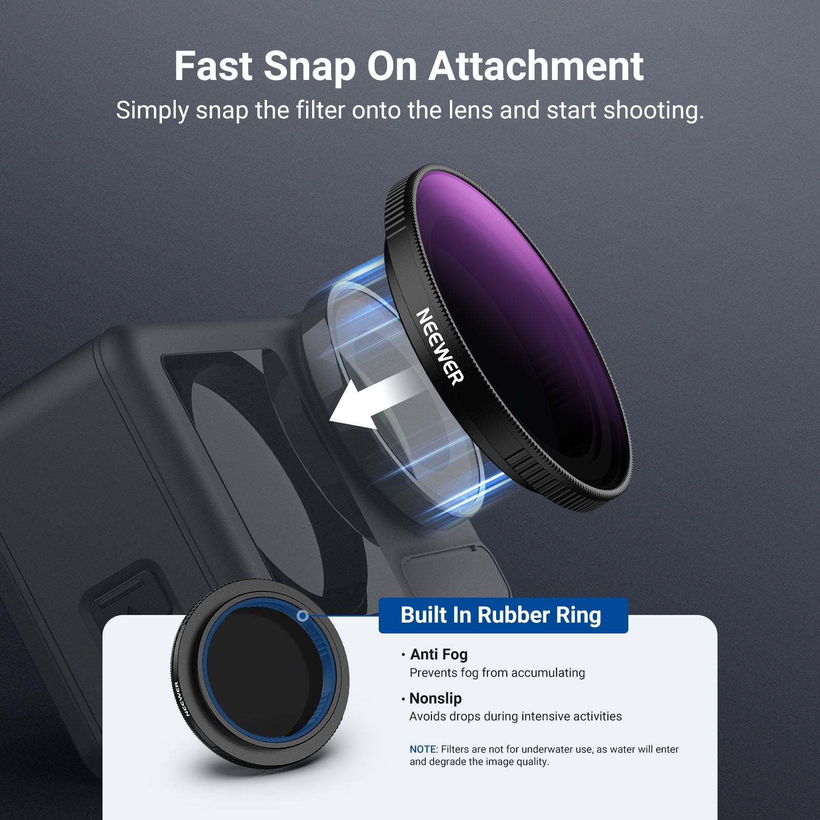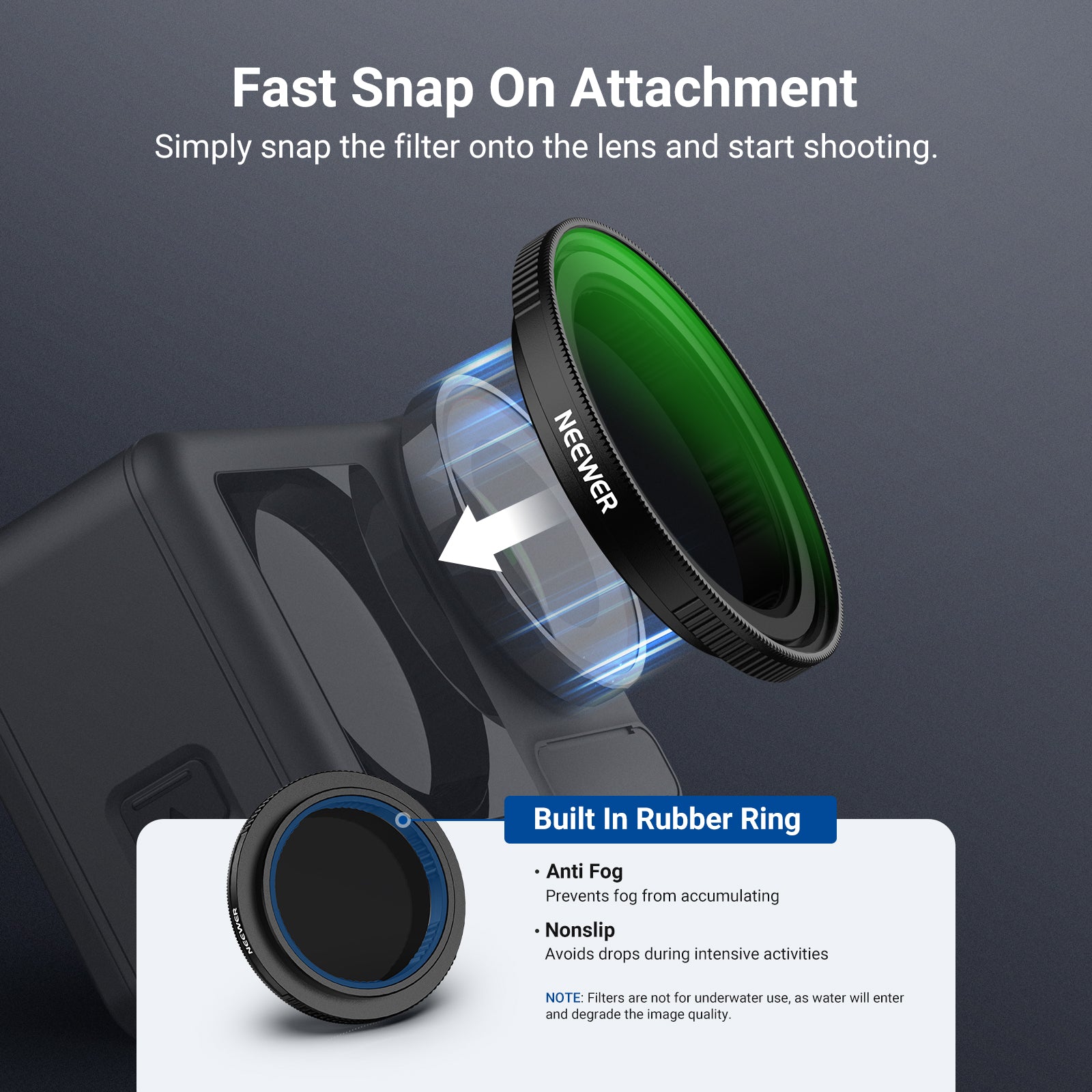 - Fast Snap On Attachment- Simply snap the filter onto the lens and start shooting. Note: The filter is not for underwater photography, as water will enter and degrade image quality