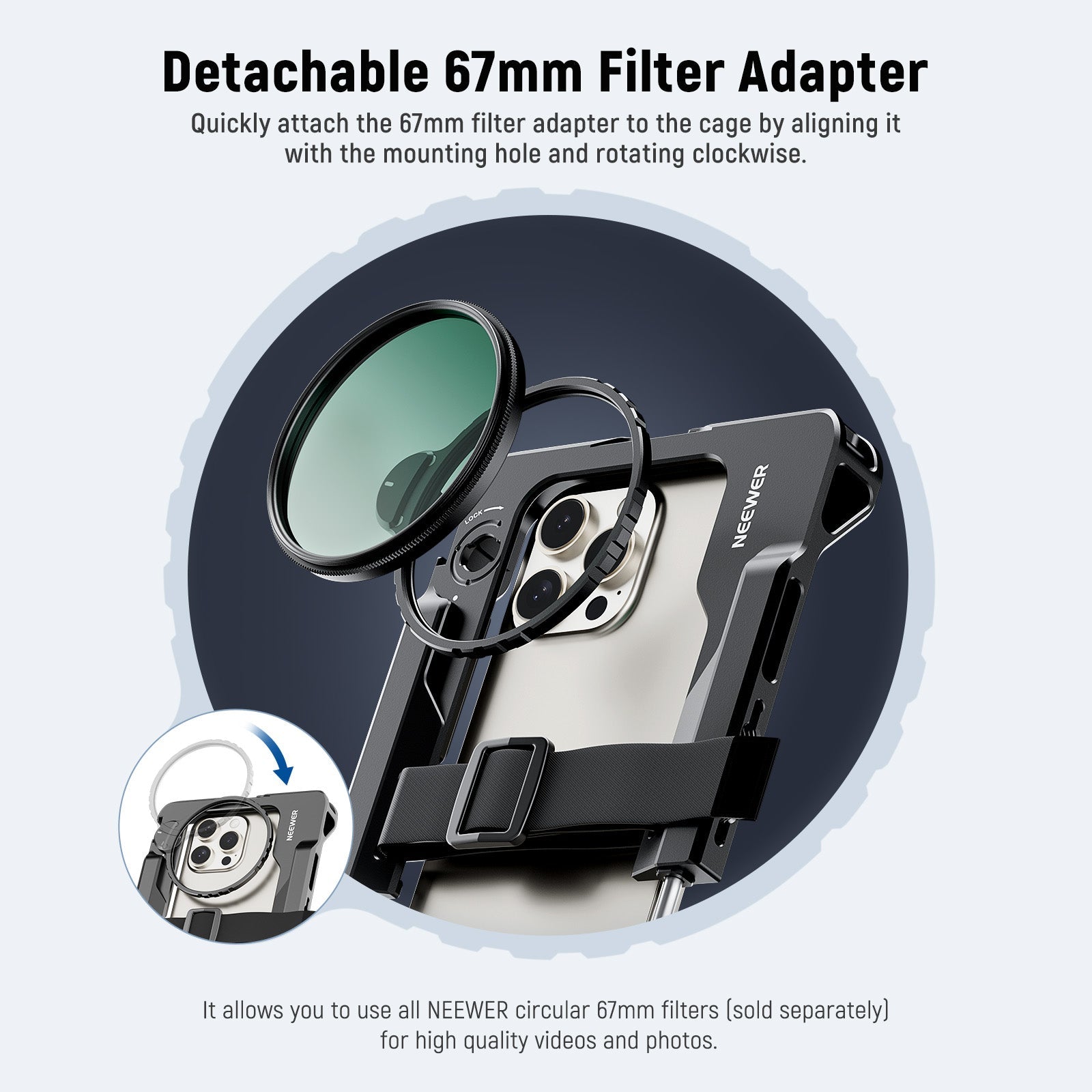 - Detachable 67mm Filter Adapter- Quickly attach the 67mm filter adapter to the phone cage by aligning it with the mounting hole and rotating clockwise. It allows you to use all NEEWER circular 67mm filters (sold separately) for high quality videos and photos, including ND, CPL, UV, ND/PL, VND, Black Diffusion, stars, light pollution reduction, gold/blue streak, graduated color lens filters