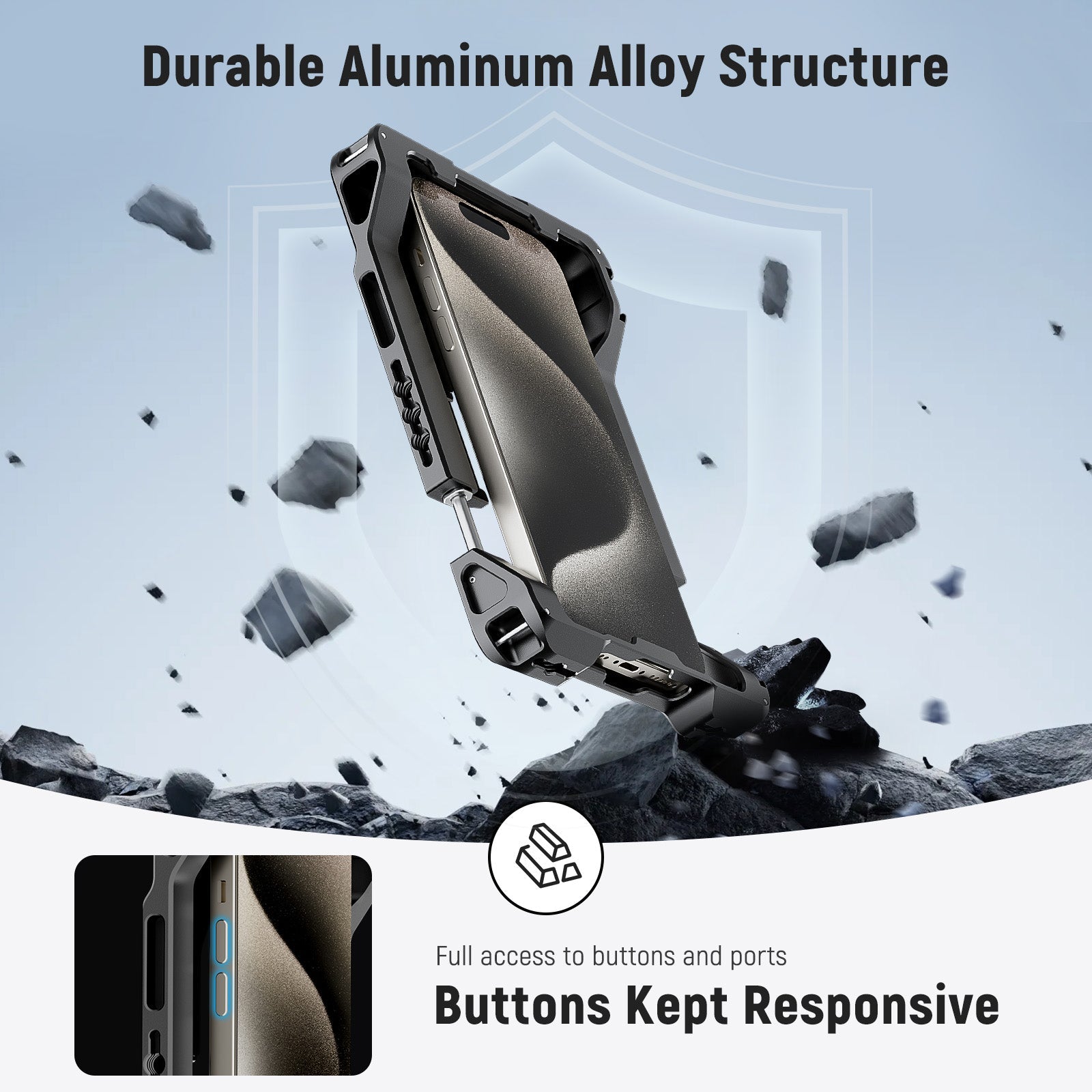 - Durable Aluminum Alloy Structure- Solidly engineered with black anodized aluminum alloy, this phone video rig is a protective and reliable phone stabilizer for video recording outdoors or at home while protecting the phone from bumps and shocks