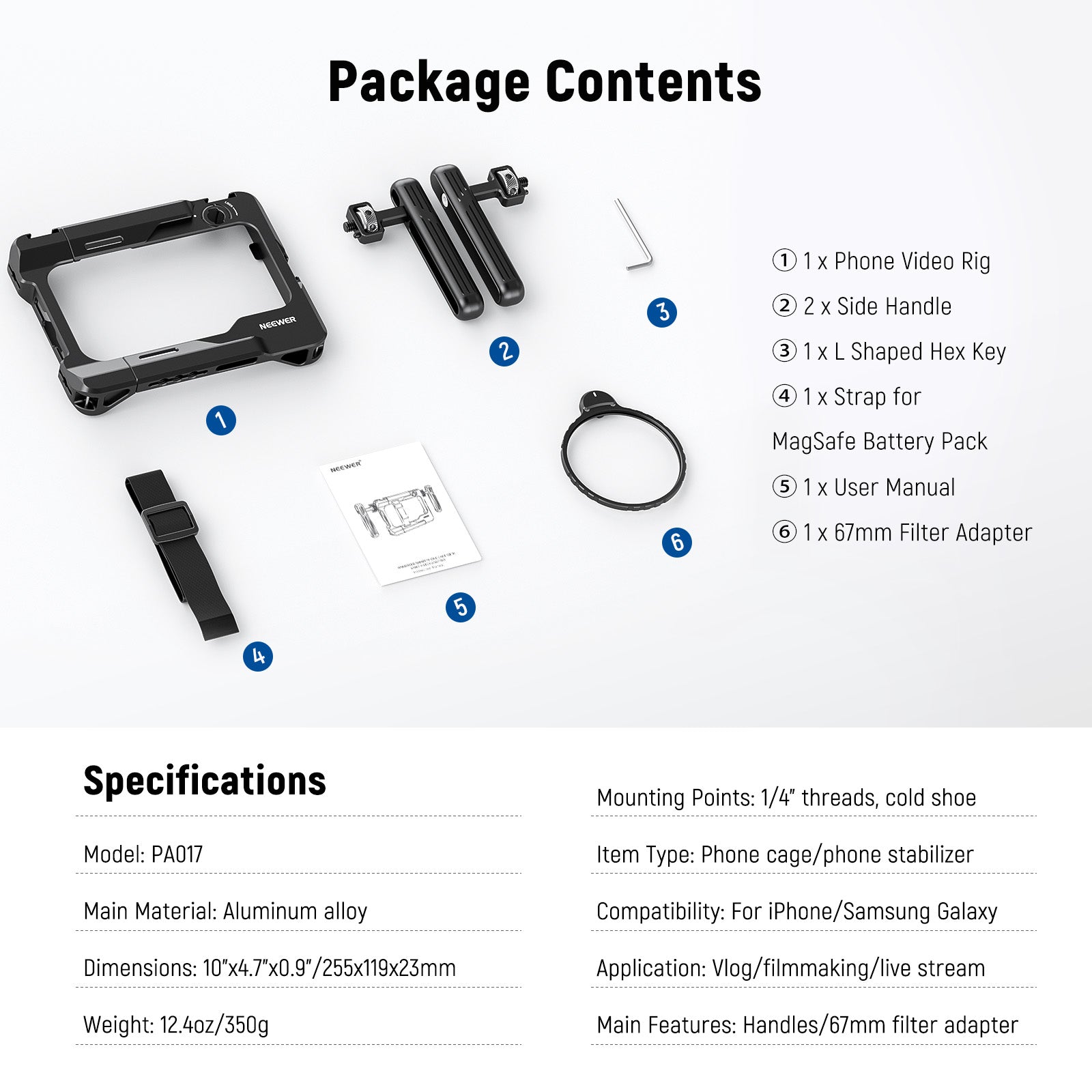 - Multiple Accessory Mounting Points- Multiple 1/4" threads and cold shoe mounts enable convenient accessory mounting. One cold shoe mount with anti drop pins is compatible with DJI Mic Transmitter, others can connect CM14 PRO mini vlog microphone, CM22/CM28 wireless lavalier mic, PL81/RGB61/RGB62 mini LED light, PA005E Bluetooth shutter release side handle, and CA070 1/4" D rings neck strap. A strap can be tied to the cage to secure the MagSafe battery pack
