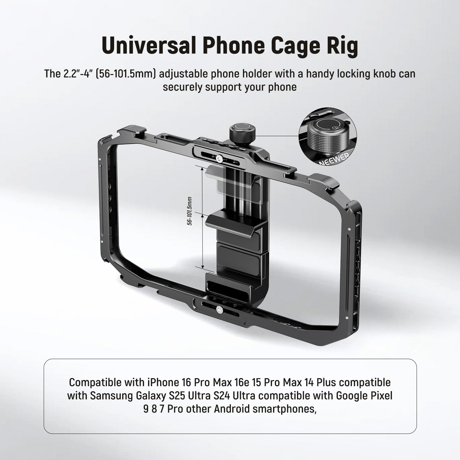 - Universal Phone Cage Rig- The 2.2"-4" (56-101.5mm) adjustable phone holder with a handy locking knob can securely support your phone—compatible with iPhone 16 Pro Max 16e 15 Pro Max 14 Plus compatible with Samsung Galaxy S25 Ultra S24 Ultra compatible with Google Pixel 9 8 7 Pro other Android smartphones, ideal for content creator essential photography and videography stabilizer accessories, video maker and influencer must have phone camera filming gear